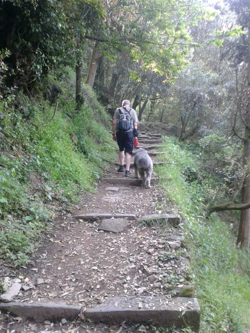 We walked a circular 10kish and must have climbed at least 10,000 steps. We followed the old trails over the ridges and down to 2 cinque terre villages. Sometimes in the mist but mostly in the sunshine. Misty was the real star of the day and we believe that she would follow us to hell and back. ( she probably thinks she already has ☺) The best part of the day for her was probably immersing herself in the streams and rock pools trying to drink them dry and invoking a water fight with a French family which of course we all joined in.