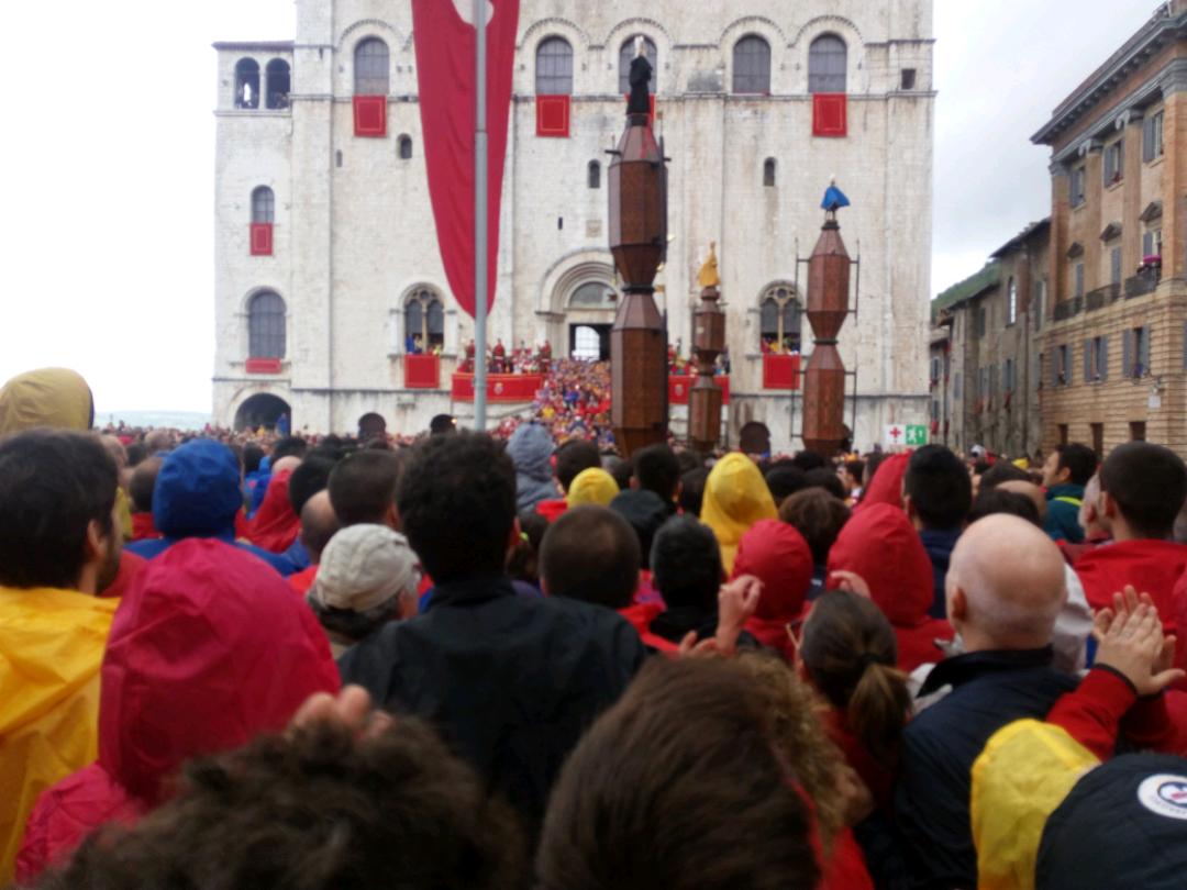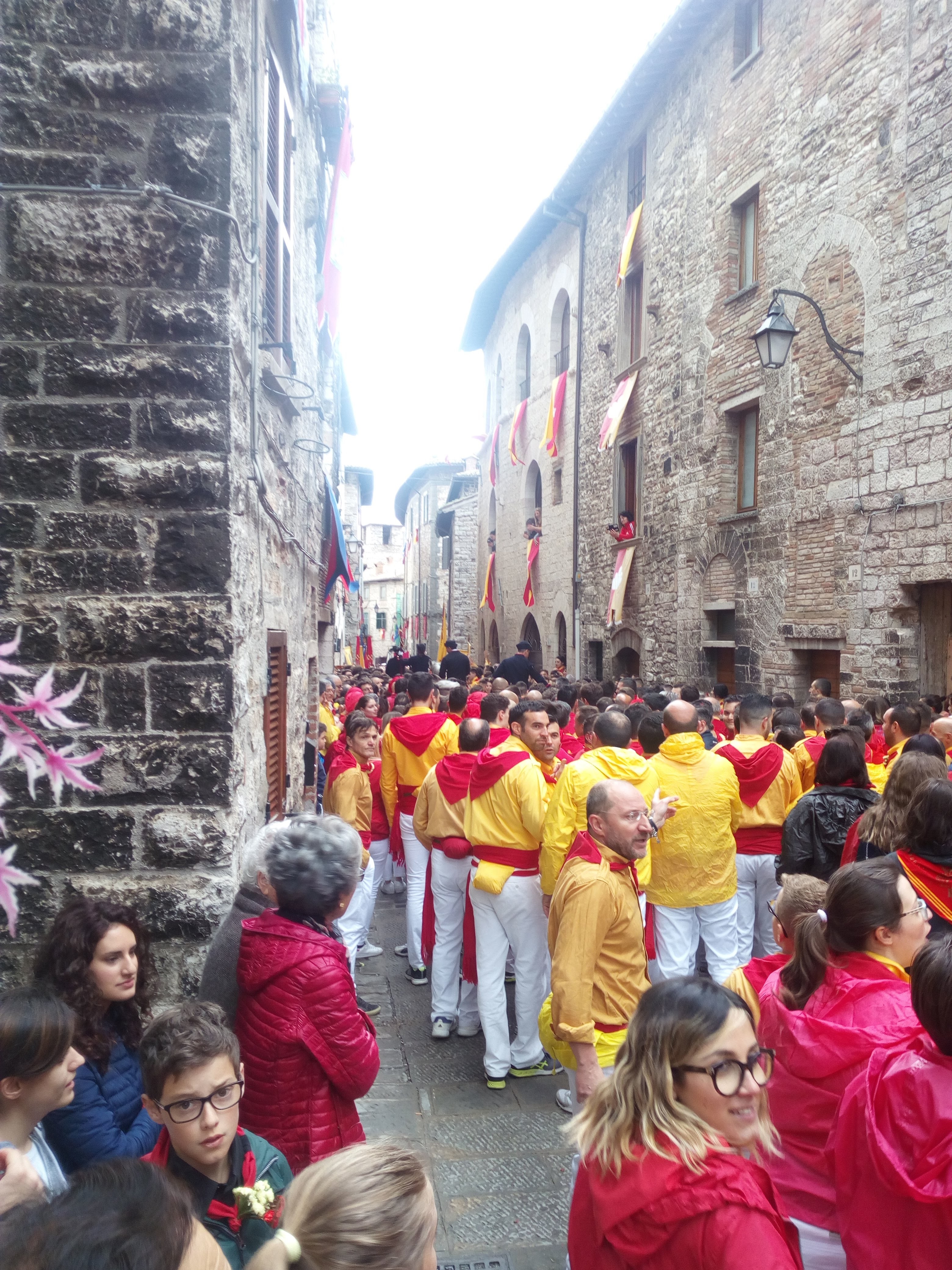 Gubbio was so different full of people, the buzz of excitement and the obvious camaraderie of the locals made the Ceri festival something not to be missed. We drank coffee with the locals, and were squeezed shoulder to shoulder in the main square whilst the teams, after a lot of processions, formalities and roaring crowds, chased each other 3 times round the flagpole to mark the start of the race up to the church of St. Ubbaldo on the top of the mountain.