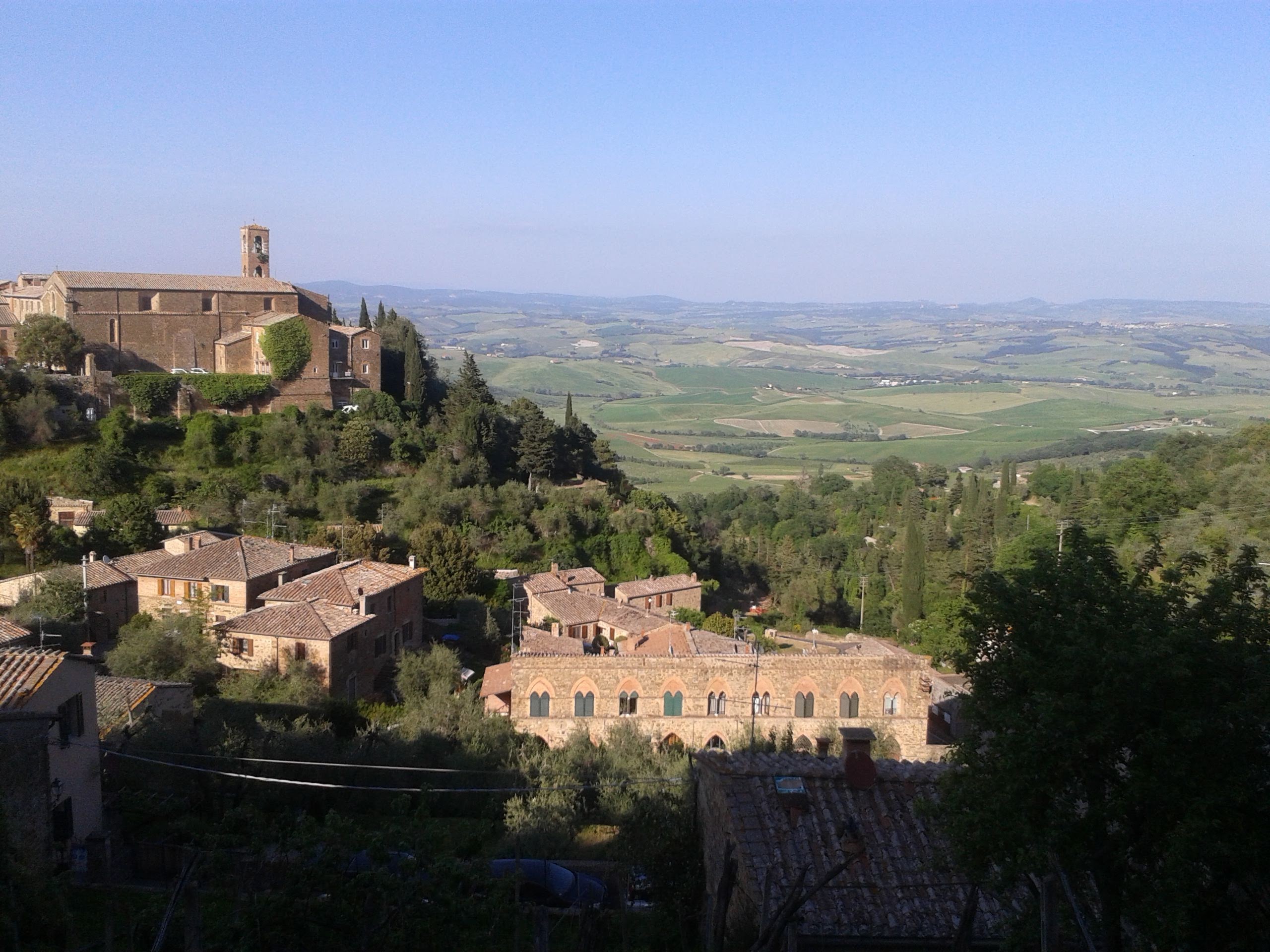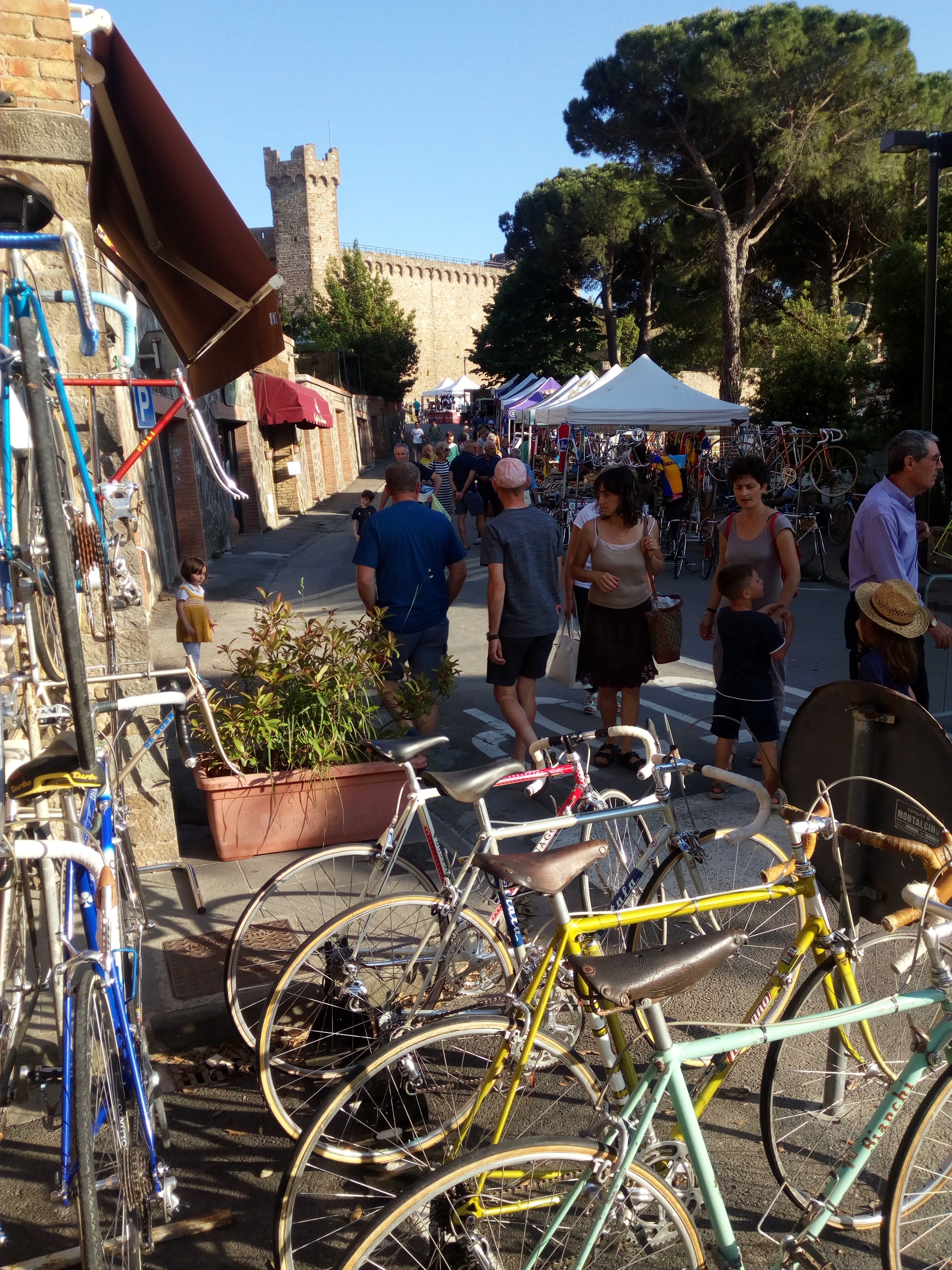 Set out again at about 4pm. Could not get parked in Montalcino , Loads of people ,so went on to Buonconvento. a pleasant walled town with a coop and a gelato shop. This refreshed us enough to head back to Montalcino to try out luck again. Found a parking space and walked into the town. Only then did we realise it was so busy because of the vintage bicycle rally (l’eroica) . Lots going on today with the ride tomorrow. Nearly lost Ian in a market of bits of old bikes. Despite this the views were amazing and we were pleased we made the effort.