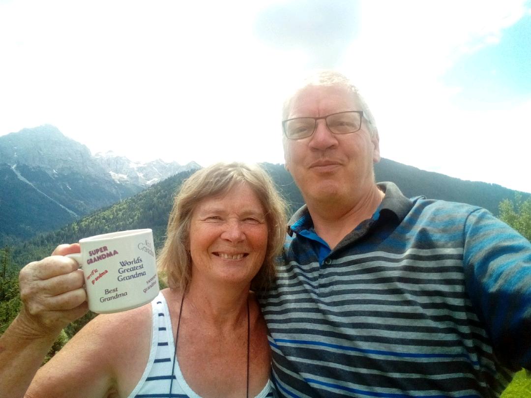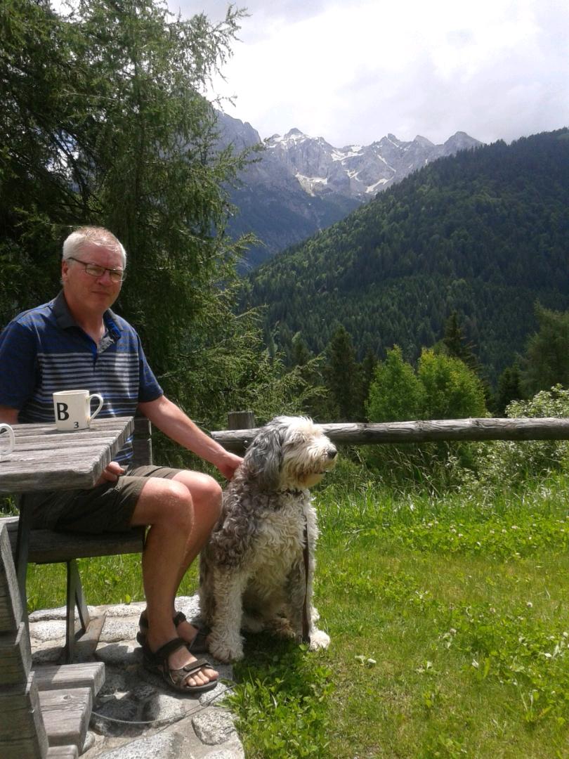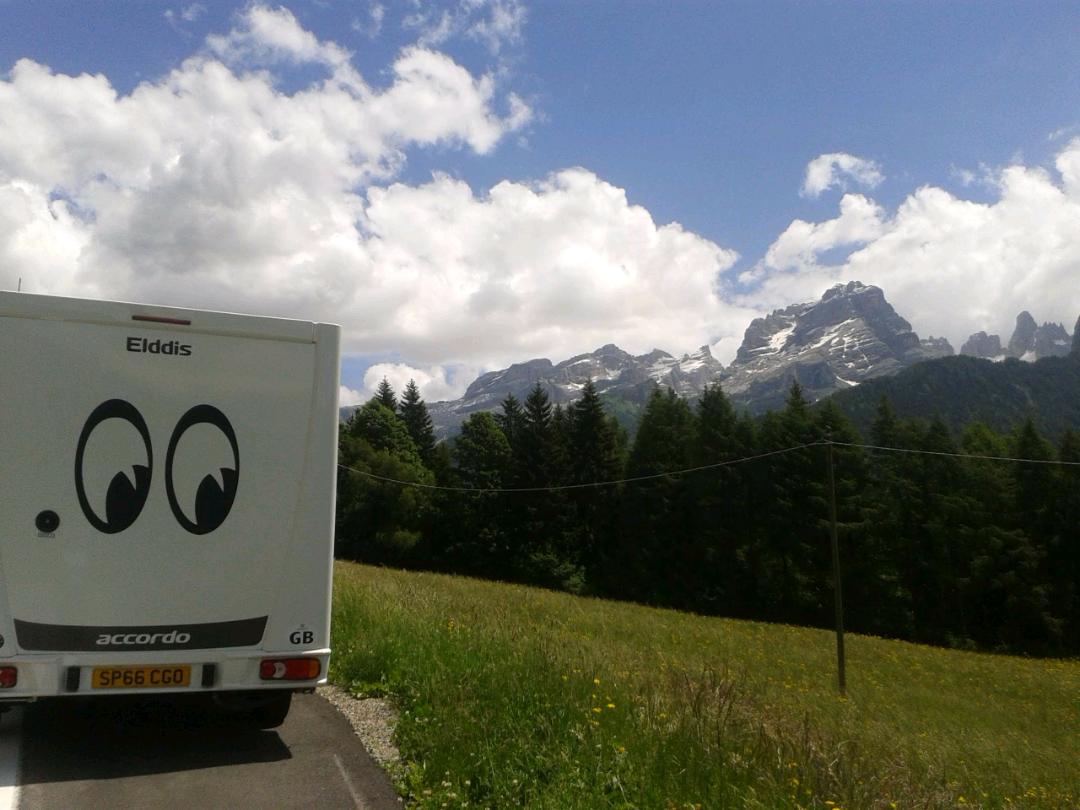Time to go down again and find our overnight stop and walk the wee dog. Found a circular walk about 2 hours in length. Walked through alpine meadows awash with colour, paths steeply winding through pine forests, and chalets with beautiful views. Misty also found several mountain streams which she loved and we had to stop her going head first over a water fall. She also has a bit of a chase of a rather dark squirrel. She enjoyed her walk today and so did we.