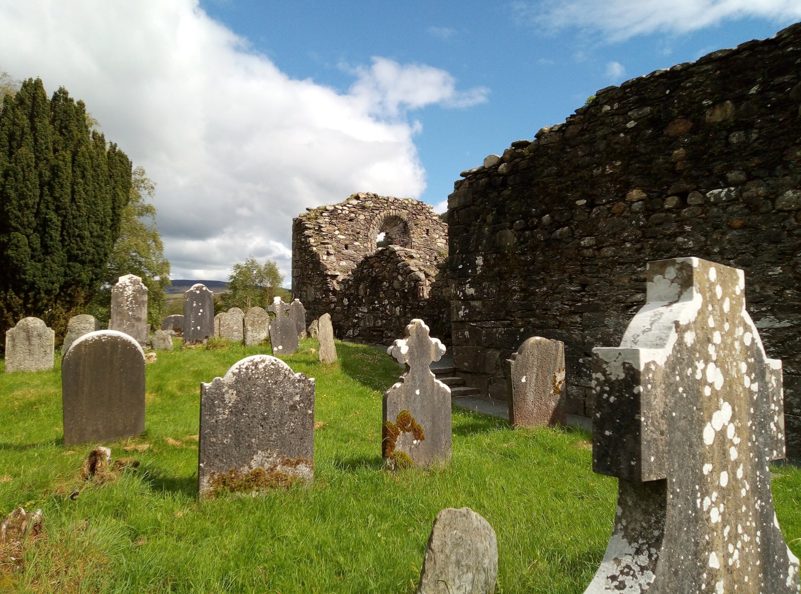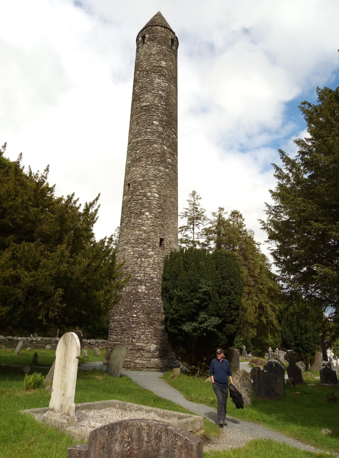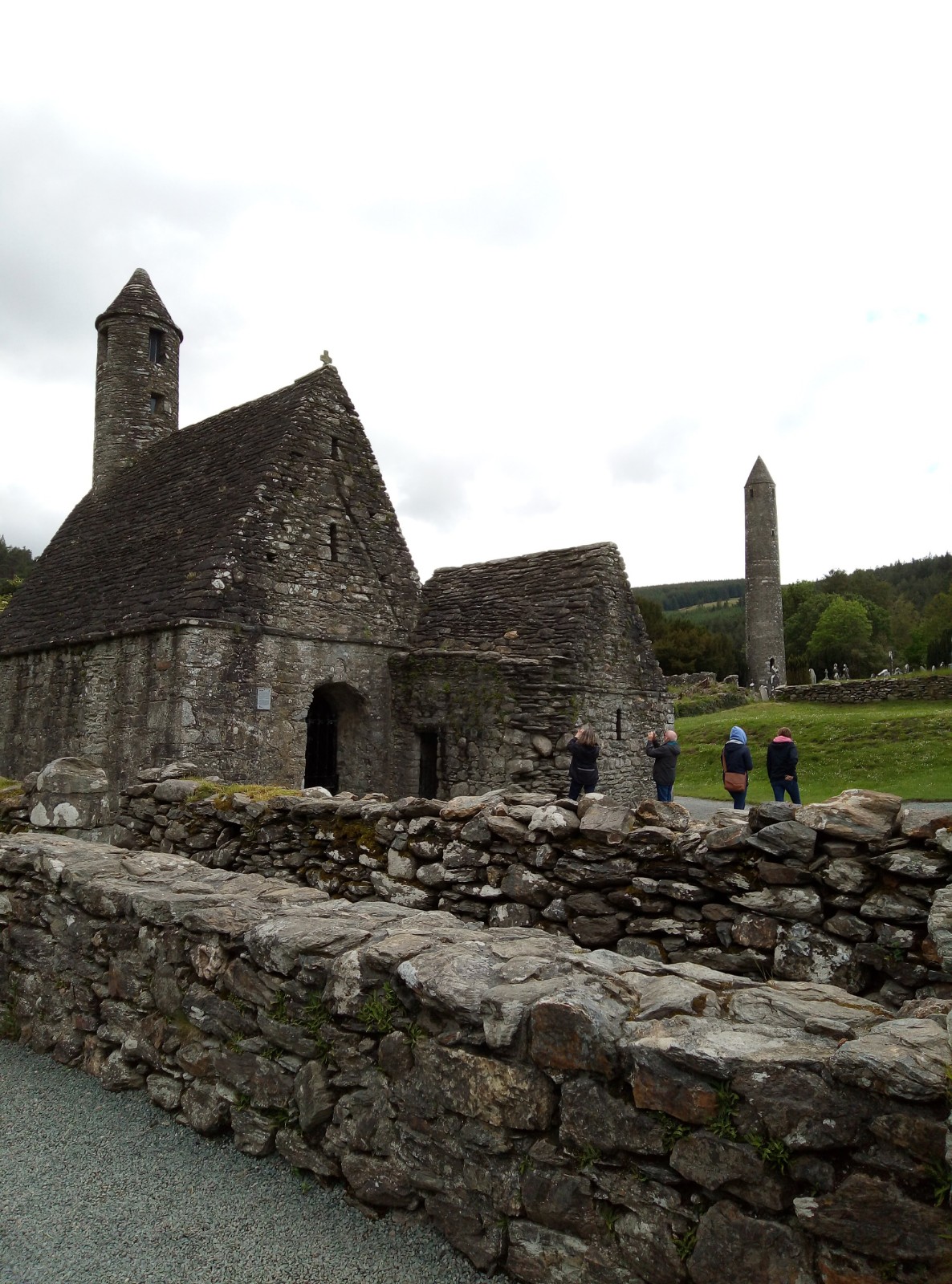 After chips and ice cream for lunch from the vans located in the car park, we left misty sleeping and walked down to the monastic site at Glendalough. This included a cathedral, a 100 ft round tower, a lovely little church with a cobble stone roof all set in a grave yard. In this case small is very beautiful.