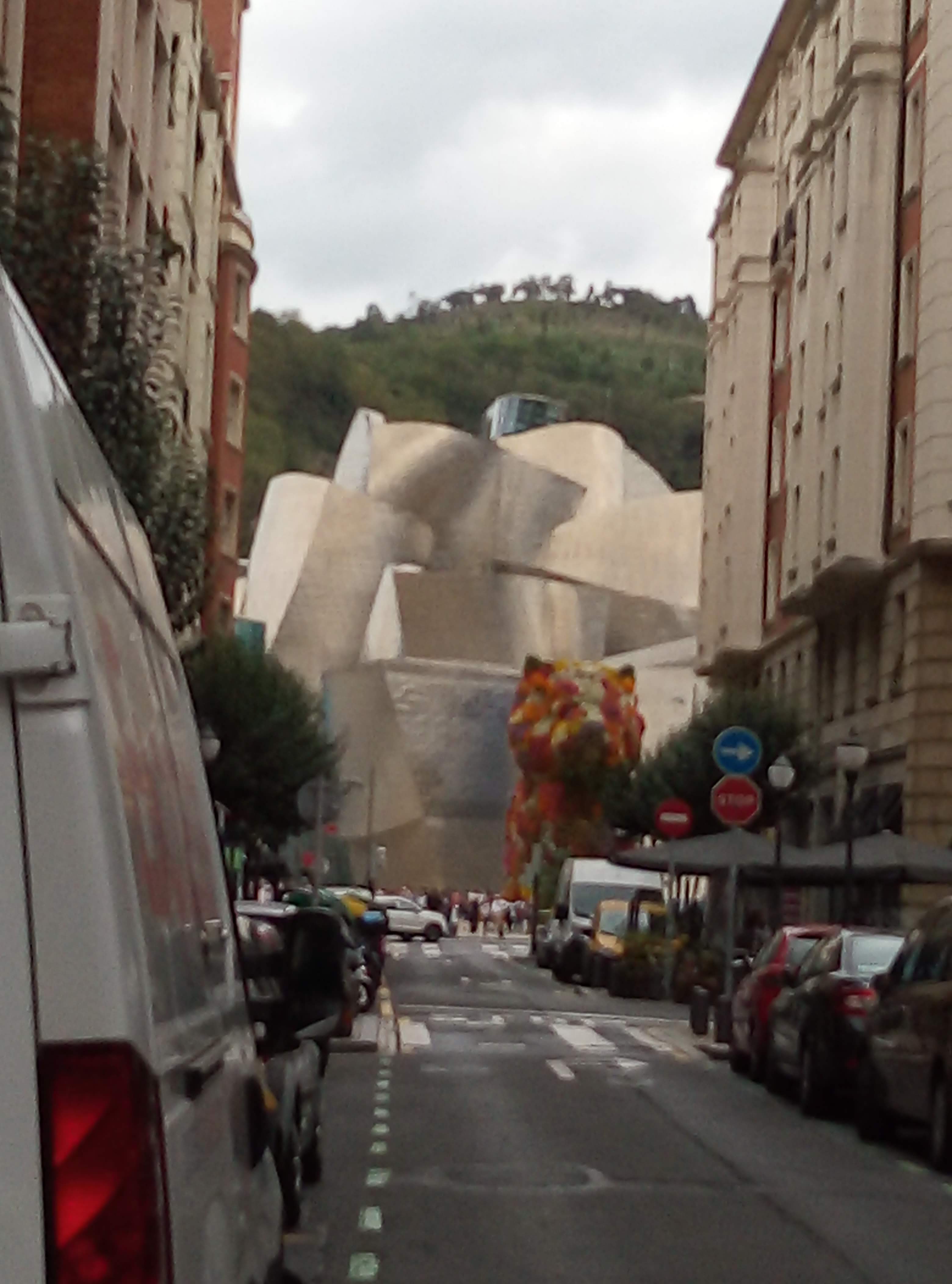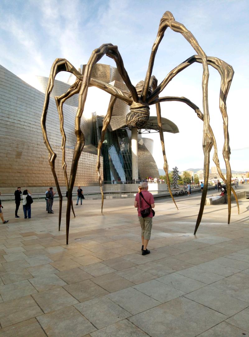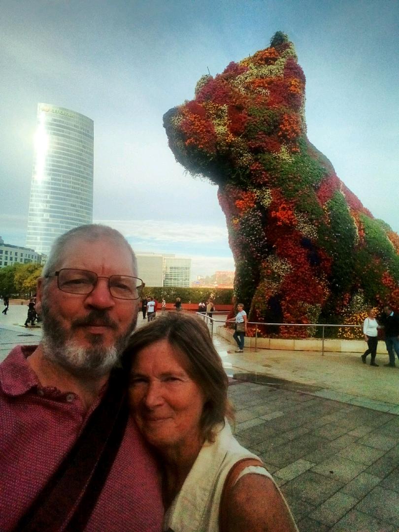 Down the funicular again towards our cultural hit for the day. What a magnificent building, the Guggenheim museum is, way better than the art on the inside!! Only one exhibit really made us feel artistic in a personal space kind of way. In fact the 3 very humerous klick clacks, 3 men dressed up with wooden clackers for mouths were the best thing there and they were Street performers. The giant flower puppy was also amazing. We were really pleased we had taken the time and effort to visit and enjoy. Frank Gehry the architect, your awesome.