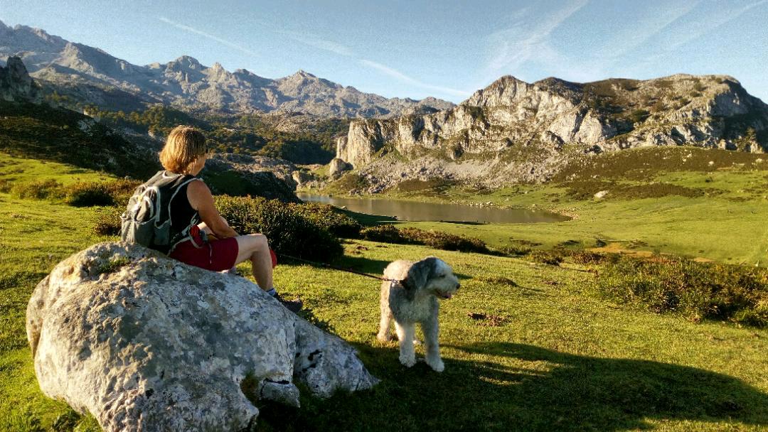 While it was relatively cool in the morning we took Misty on a 2 hour hike. She loved scrambling but was exhausted by lunchtime and it got too hot for her. So after lunch we did a circuit of the 2nd lake on our own, leaving misty in the cool of the van, to the sound of an orchestra warming up. Now in Spain all the animals have bells which makes a lot of bells. Cows, goats, sheep, horses all have them and it seemed only the eagles didn’t. At least none of them could creep up on us as even the cows acted like mountain goats scrambling on the rocky outcrops often above us.