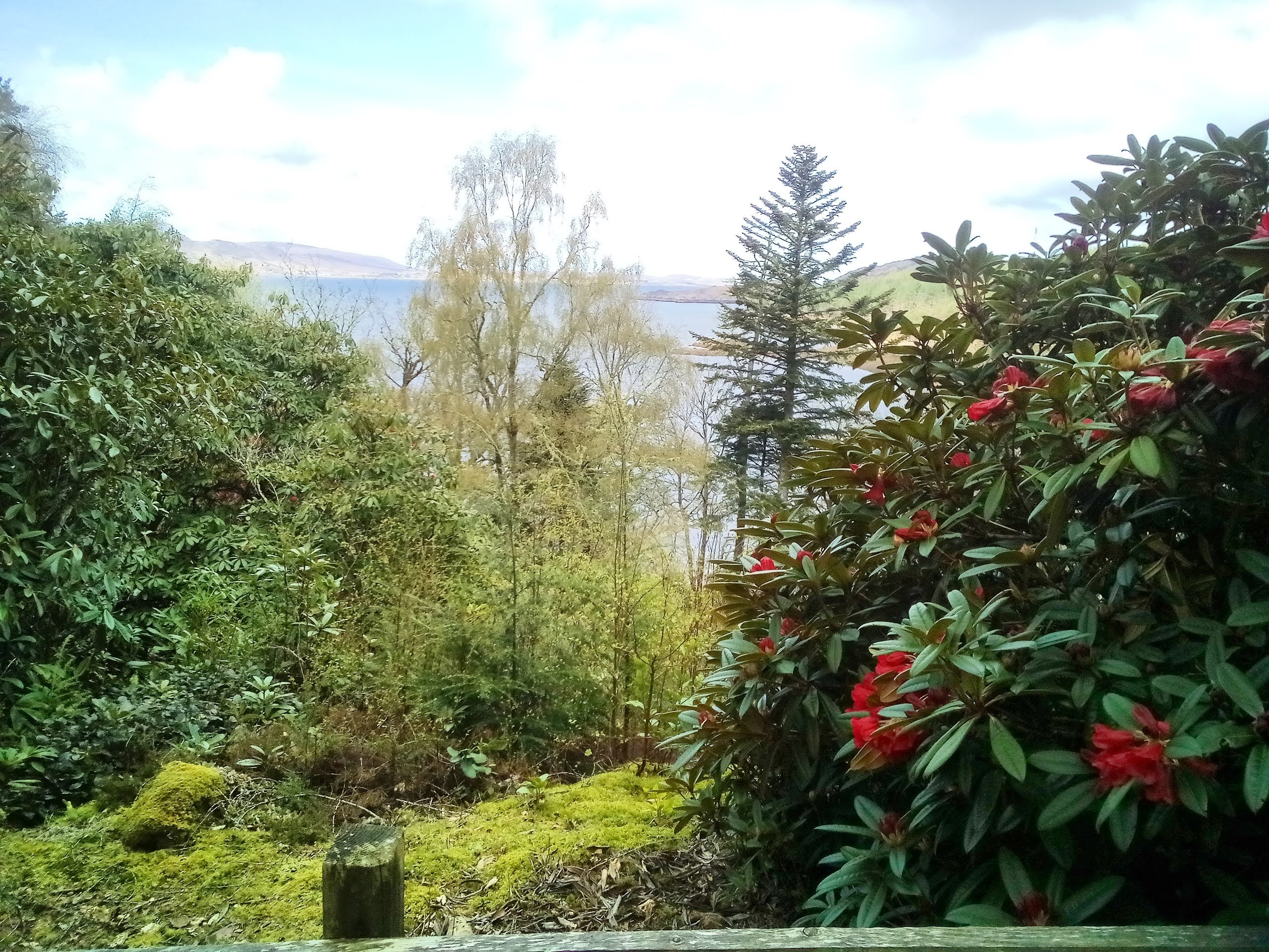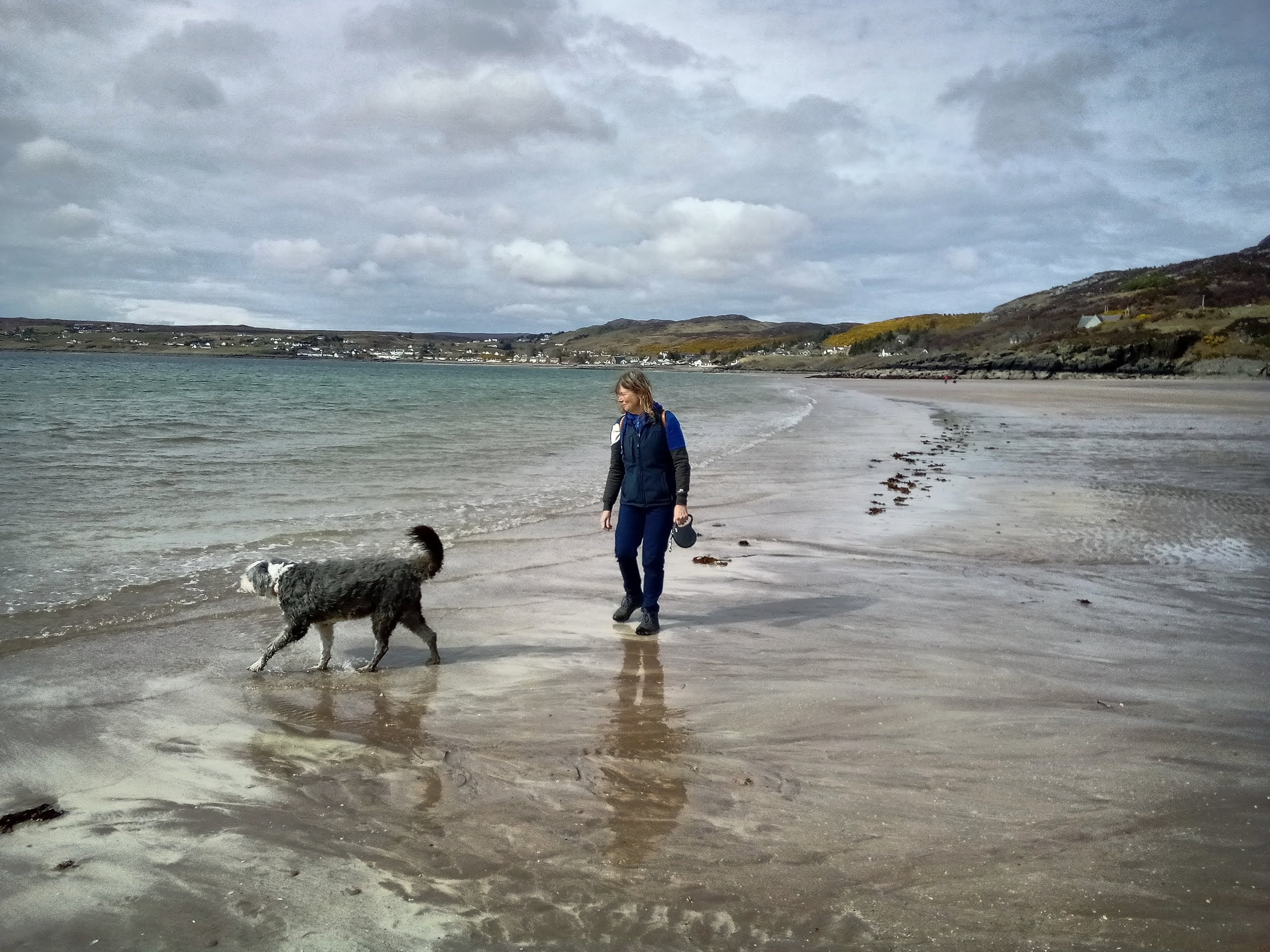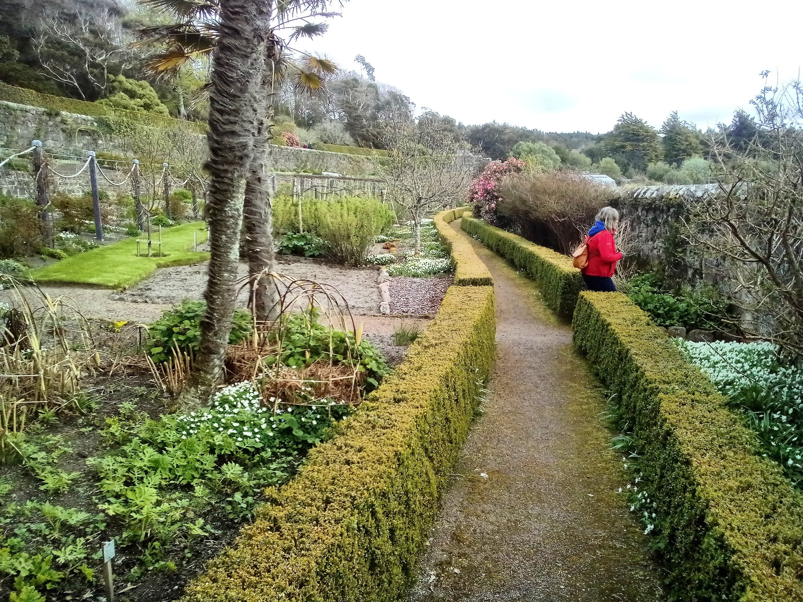 The gardens were open but not the shop… Boohoo no ice cream. We wondered along very quiet windy paths looking at plants as far apart as tiny woodland anemone to huge Eucalyptus trees and tall magnificent Scots fir. The curved walled garden was magnificent bit not in full bloom yet. A lovely shelted spot to look over the water. We could not coax misty out of the van (not that she was allowed in the gardens anyway) so after looking at every flower, bush and tree we headed to the beach. We believe the salt water helped her paws and it was a stunning beach anyway. Heading back to the campsite now.