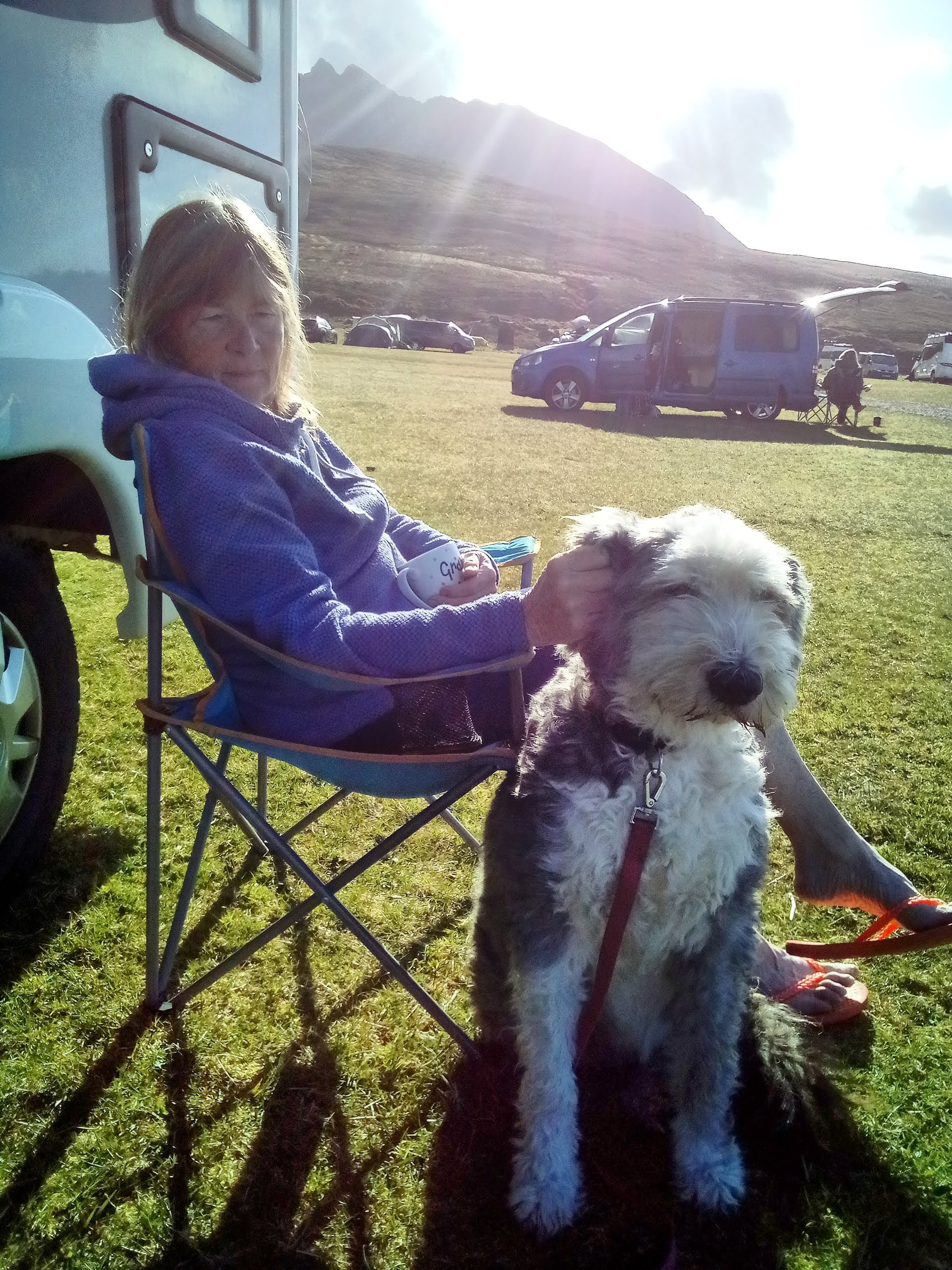It was a lovely track to the end of the peninsula. We sat having lunch sat in the sunshine overlooking a wee loch. Awesome. We had made good progress so thought lets make a new route back. We had already seen our first magic moment when a sea eagle flew overhead. The second was when we stopped to finish our coffee by a small lochan when around the corner came four large deer. Two splashing in the water. Although we were down wind the the second two seemed to sense us although we were very quiet. The whole route was about 10 miles and on arrival back at the campsite we found the camp shop sold magnums 🍦🍦🍦 very much appreciated although maybe not quite as much as the beer back at the van.