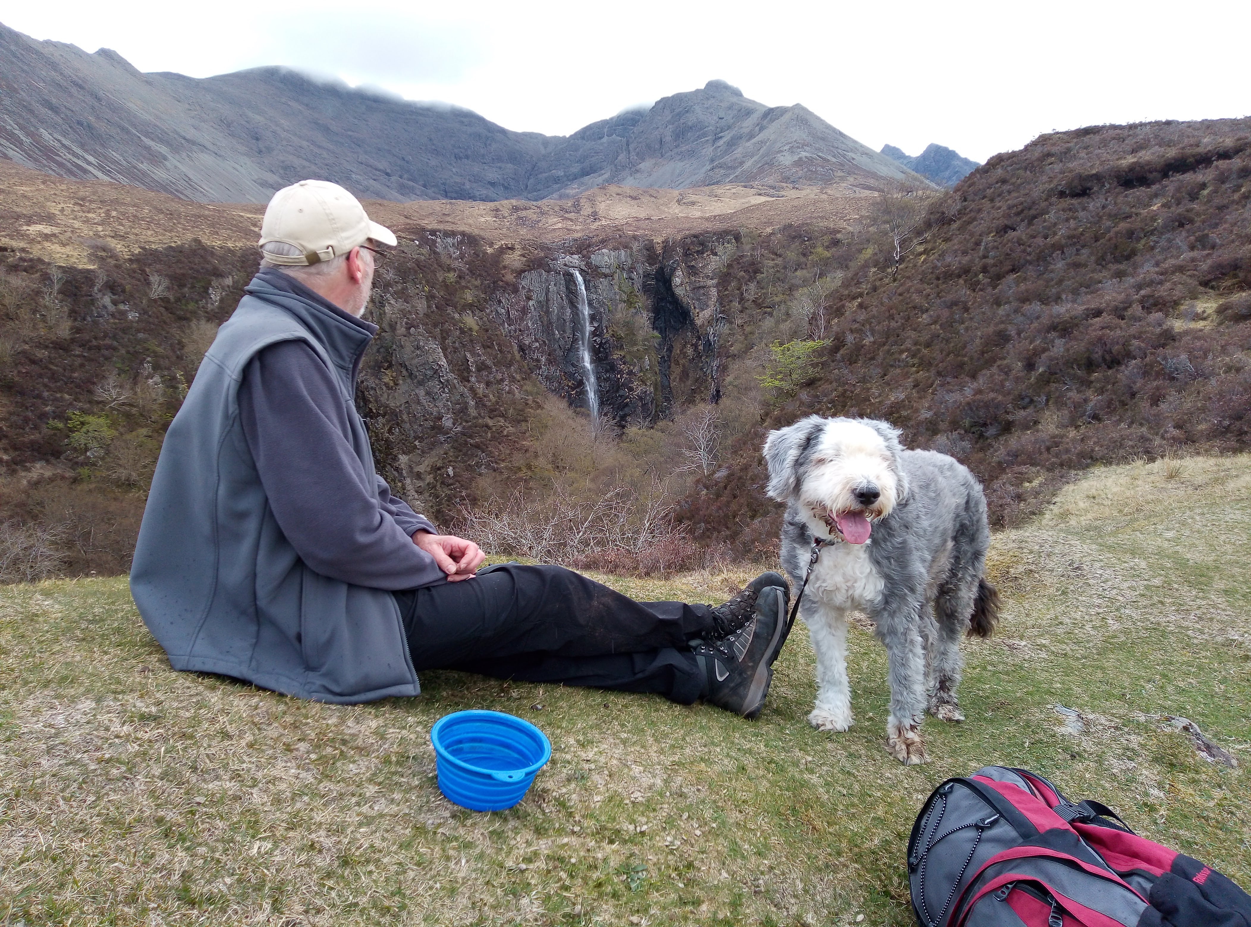 Misty was feeling a wee bit better today so we thought we would try her with a walk. She was amazing and we ended up doing a circuit above the campsite of about 4miles. Up under the Cuillins and back down again. We met several groups one of which was made up of 3 adults and 3 children aged 7, 7 and 10. We were as impressed with them as they were with Misty. They had cycled yesterday and were thinking about cycling along the same track we did yesterday as well as scrambling part way up the Cuillins. Following closely behind them was a young couple with an 18 month little girl in a backpack. Dad was sweating a bit and could not imagine what it would be like when she got to 4. The 3 adventurors camped opposite us said they were going cycling but ended up disappearing up the mountain with climbing ropes. We met a couple, John and Jill, with a dog even older than Misty and doing very well indeed. We spoke to them back at the campsite and discovered John was a UK record holder at distance swimming under water without flippers, over 7 lengths and can hold his breath for 6 minutes when free diving. They were married on Iona 2 years ago. Guess where we hope to go to sometime on this Journey and they also like Jethro Tull.