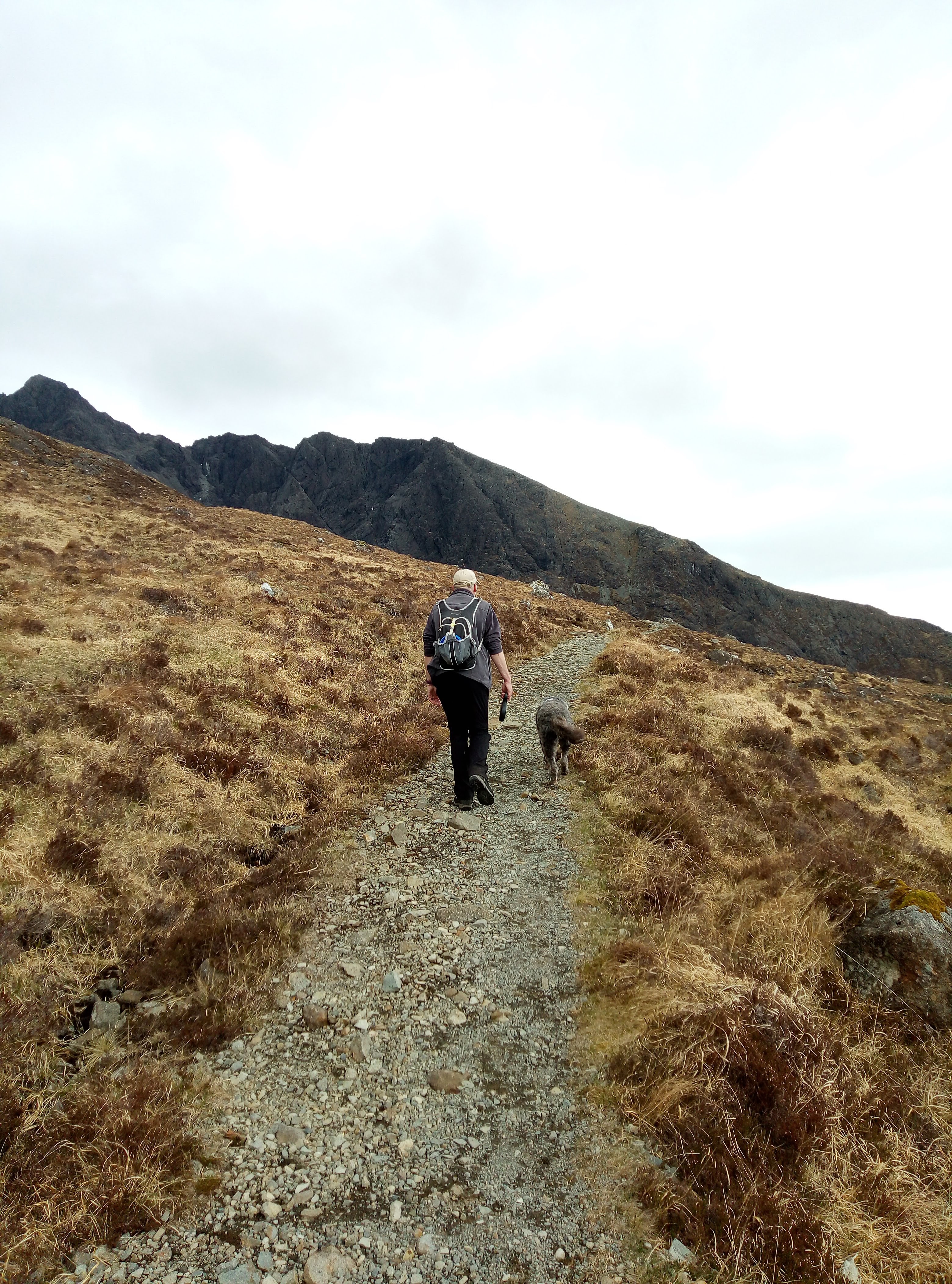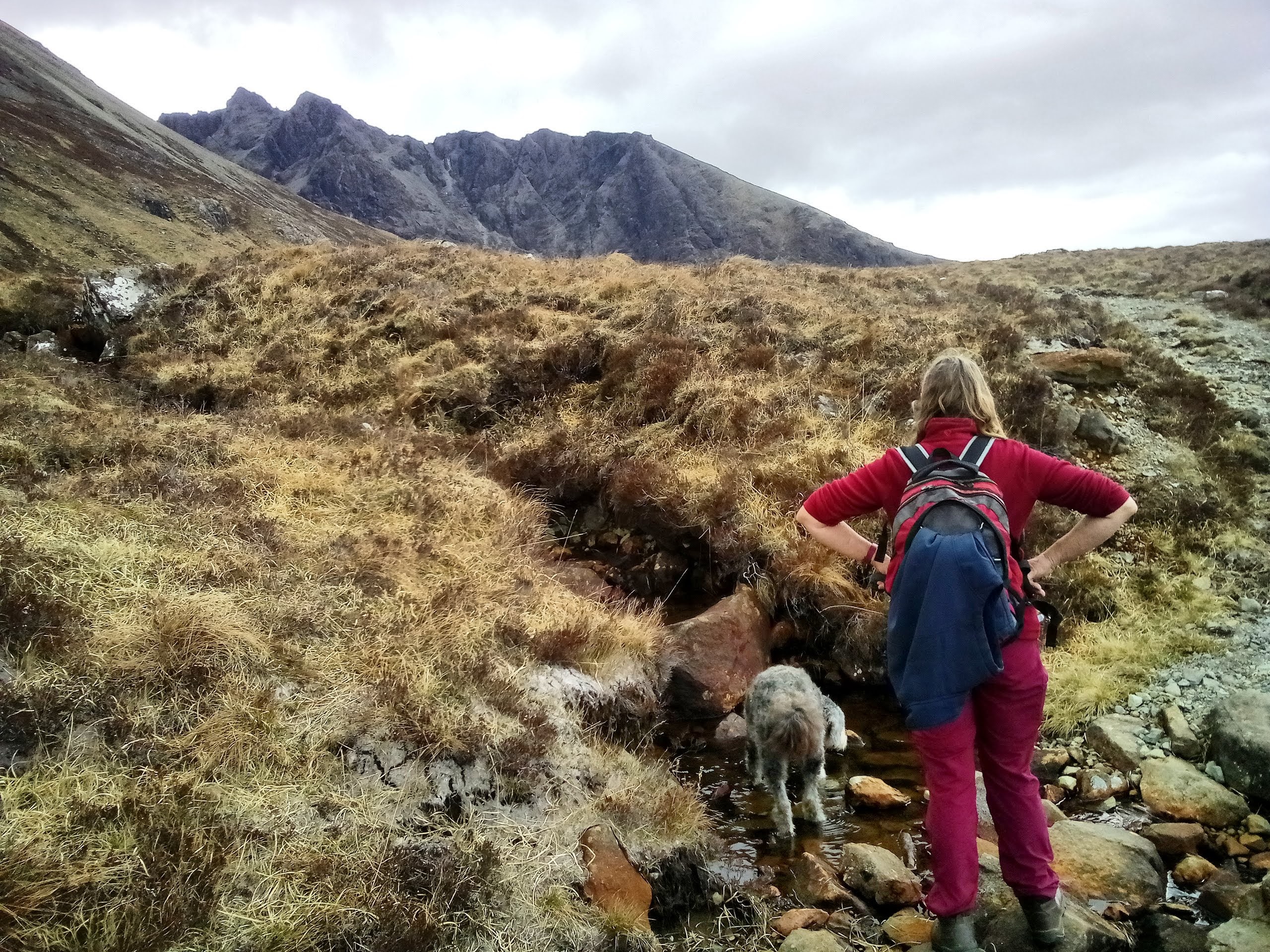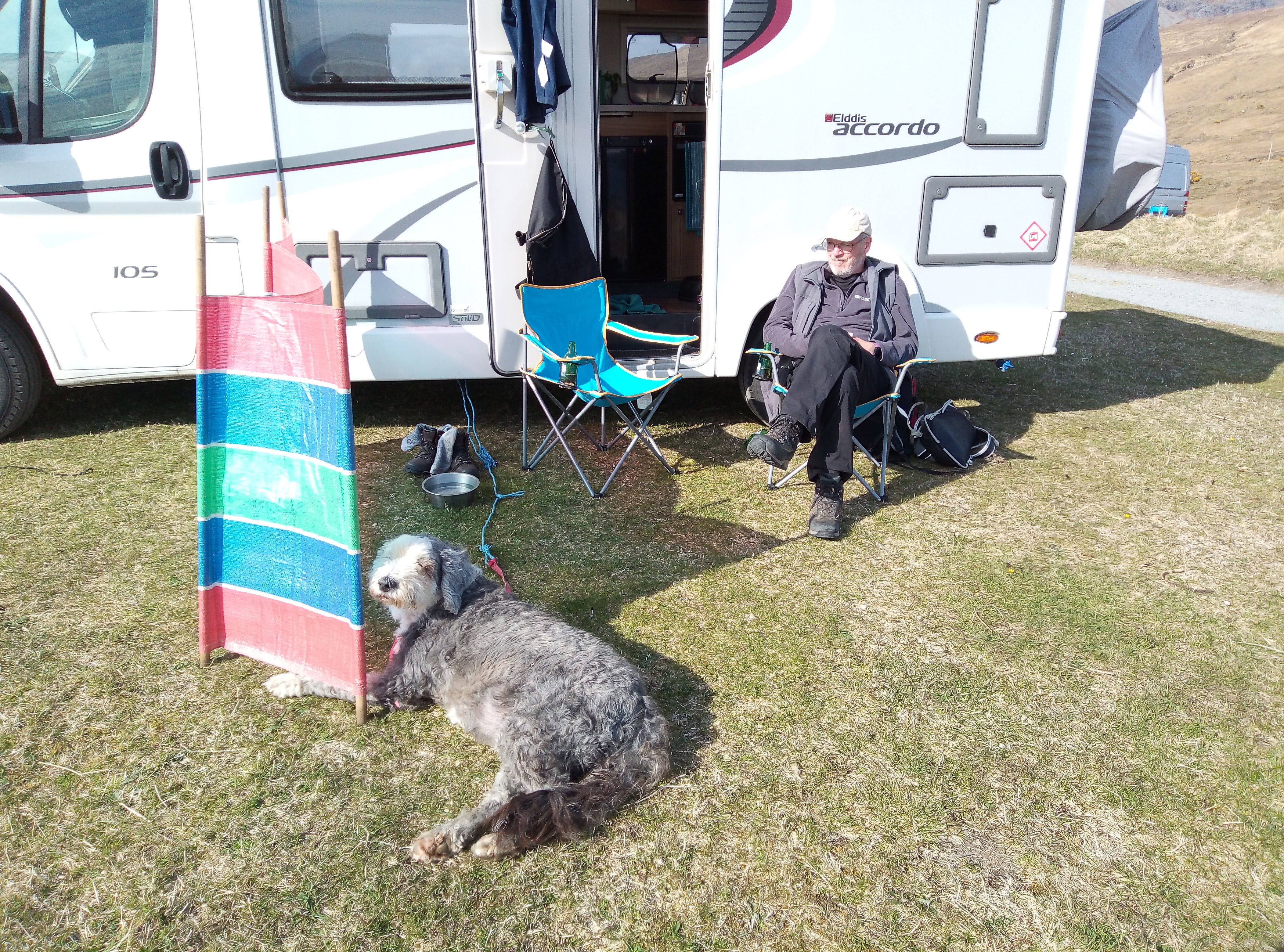 Misty was feeling a wee bit better today so we thought we would try her with a walk. She was amazing and we ended up doing a circuit above the campsite of about 4miles. Up under the Cuillins and back down again. We met several groups one of which was made up of 3 adults and 3 children aged 7, 7 and 10. We were as impressed with them as they were with Misty. They had cycled yesterday and were thinking about cycling along the same track we did yesterday as well as scrambling part way up the Cuillins. Following closely behind them was a young couple with an 18 month little girl in a backpack. Dad was sweating a bit and could not imagine what it would be like when she got to 4. The 3 adventurors camped opposite us said they were going cycling but ended up disappearing up the mountain with climbing ropes. We met a couple, John and Jill, with a dog even older than Misty and doing very well indeed. We spoke to them back at the campsite and discovered John was a UK record holder at distance swimming under water without flippers, over 7 lengths and can hold his breath for 6 minutes when free diving. They were married on Iona 2 years ago. Guess where we hope to go to sometime on this Journey and they also like Jethro Tull.