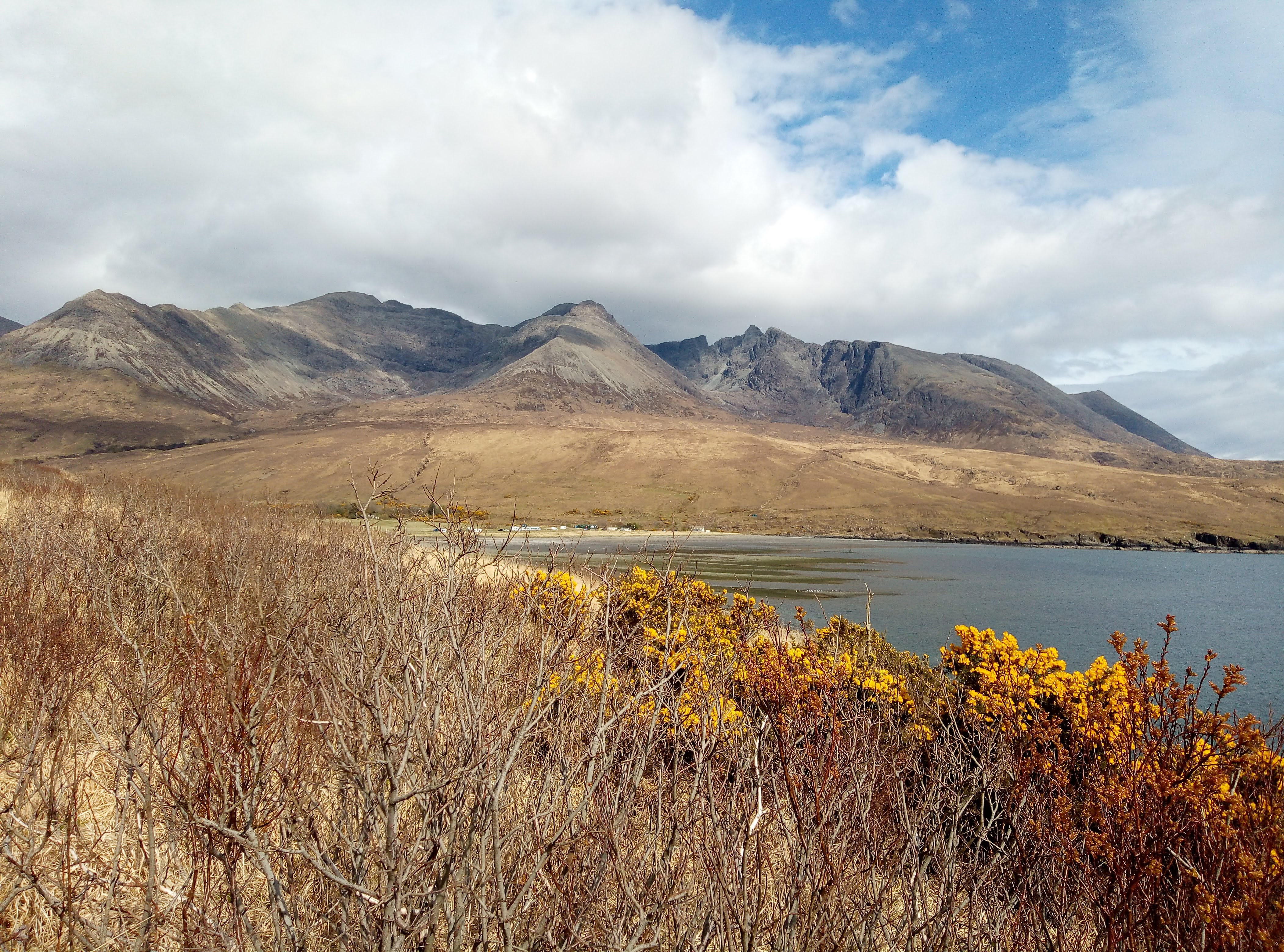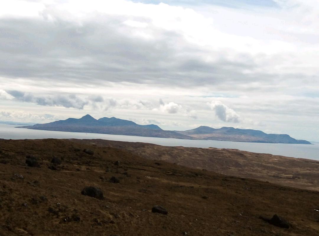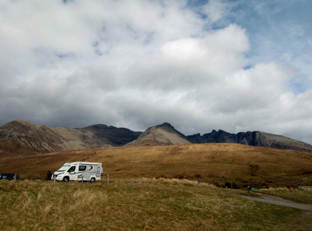 Misty was feeling a wee bit better today so we thought we would try her with a walk. She was amazing and we ended up doing a circuit above the campsite of about 4miles. Up under the Cuillins and back down again. We met several groups one of which was made up of 3 adults and 3 children aged 7, 7 and 10. We were as impressed with them as they were with Misty. They had cycled yesterday and were thinking about cycling along the same track we did yesterday as well as scrambling part way up the Cuillins. Following closely behind them was a young couple with an 18 month little girl in a backpack. Dad was sweating a bit and could not imagine what it would be like when she got to 4. The 3 adventurors camped opposite us said they were going cycling but ended up disappearing up the mountain with climbing ropes. We met a couple, John and Jill, with a dog even older than Misty and doing very well indeed. We spoke to them back at the campsite and discovered John was a UK record holder at distance swimming under water without flippers, over 7 lengths and can hold his breath for 6 minutes when free diving. They were married on Iona 2 years ago. Guess where we hope to go to sometime on this Journey and they also like Jethro Tull.