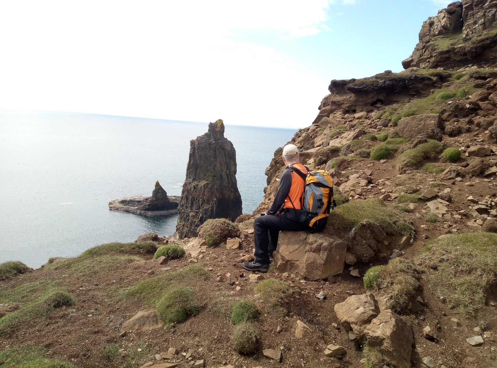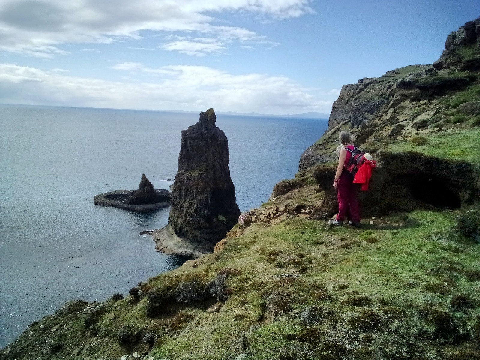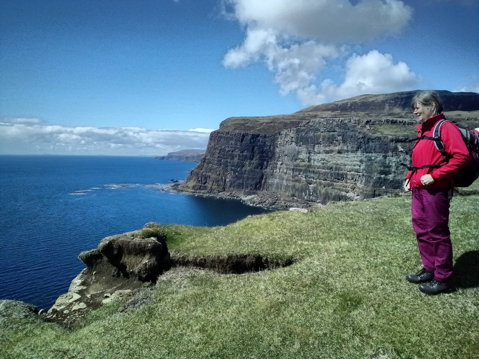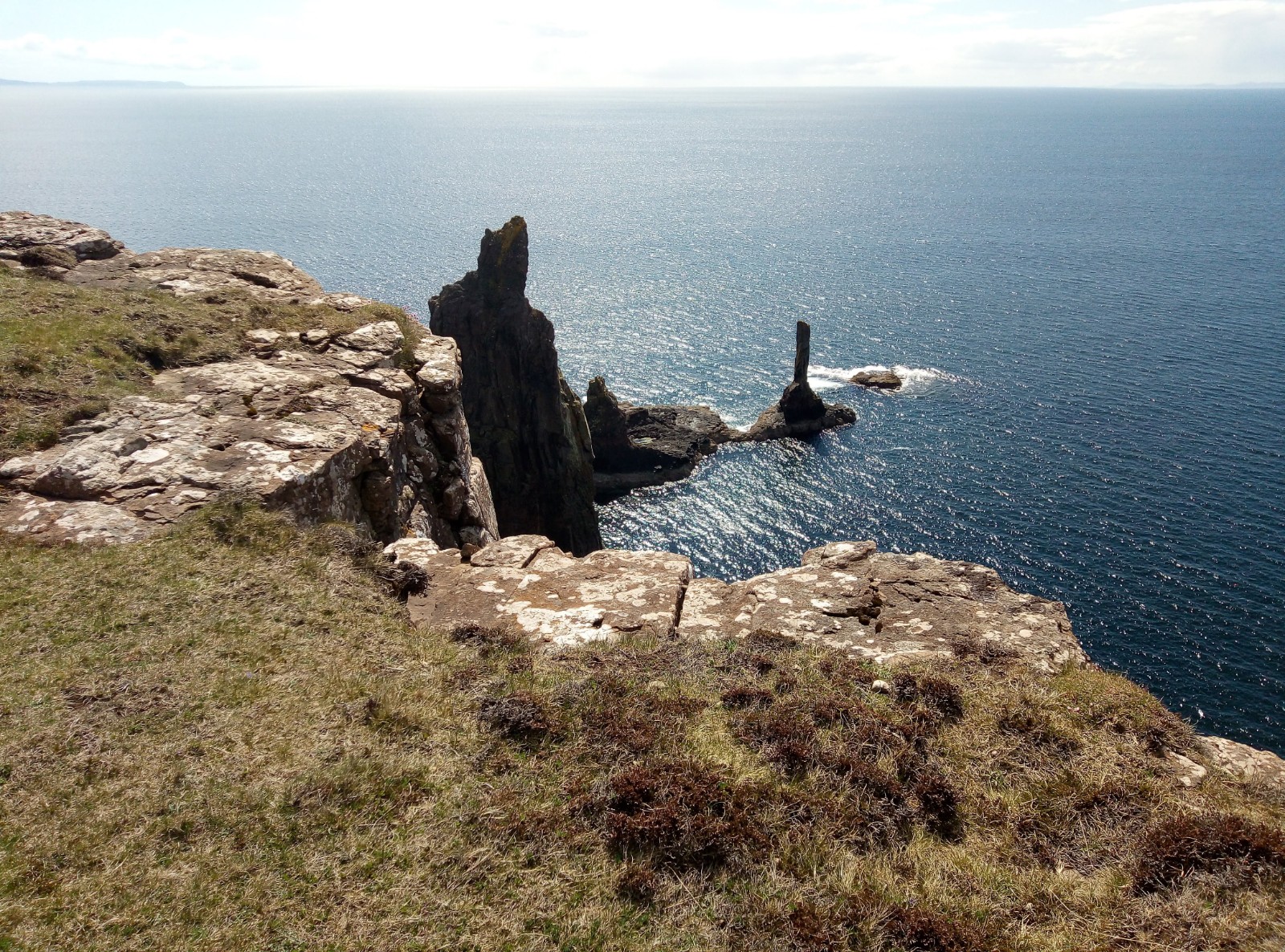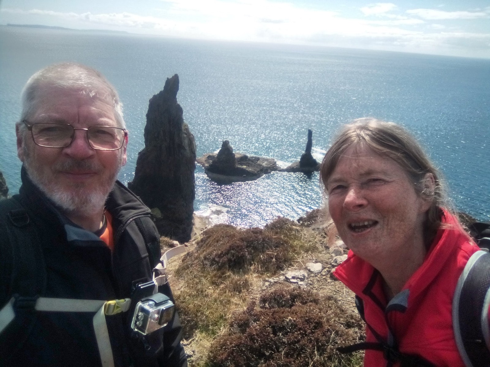 Beautiful sunny day. We headed to Orbost house, parked the van. A 5/6 mile walk through forests, bogs and over burns. And of course fantastic views. Eventually we climbed to the top of some impressive cliffs to admire the purpose of our walk the mighty sea stacks known as Macleods maidens. The largest stack is known as the mother and the smaller 2 her daughters. 😄😄😄 It was a really warm day in contrast to the last few days, so we hung around a while and ate our lunch, seeing the maidens from as many sides as possible. Alas time to head back the return journey of 5 to 6 miles. Misty must need a wee by now?? The return journey always seems longer, and indeed misty did need a wee. After walking back down the track a little ways with her we headed back to the site. The sun still shining so barbecue time although with extra layers on!!