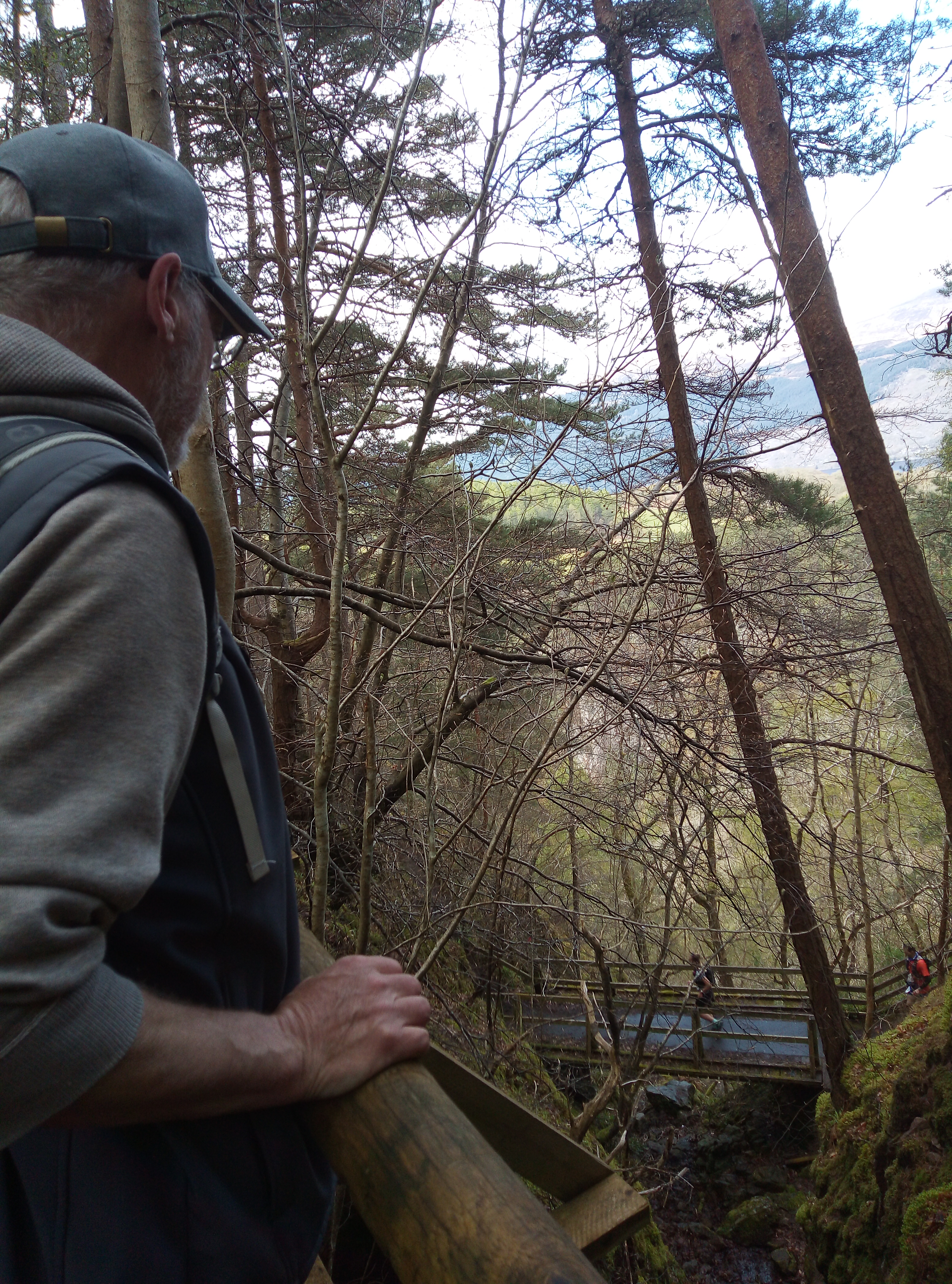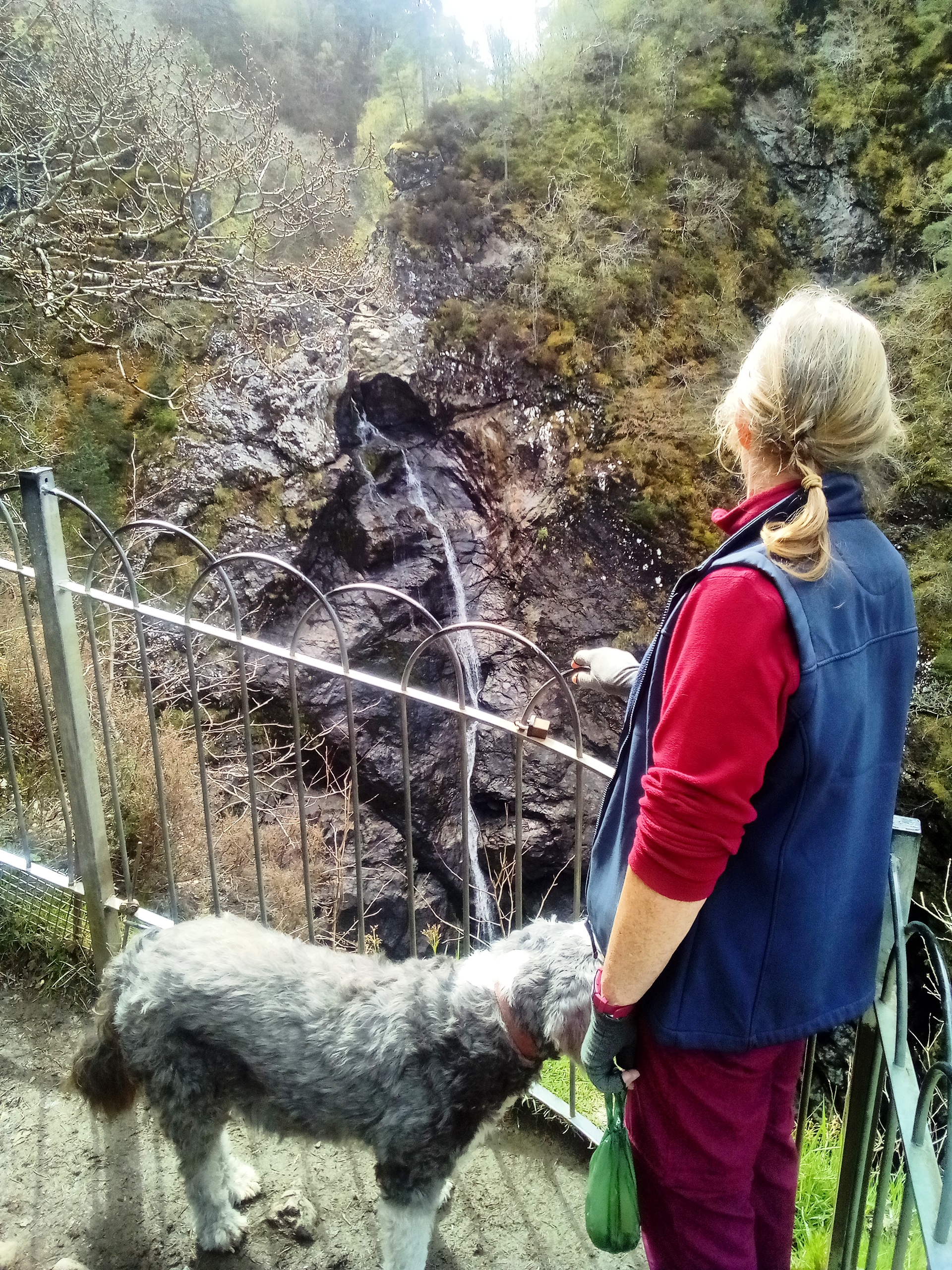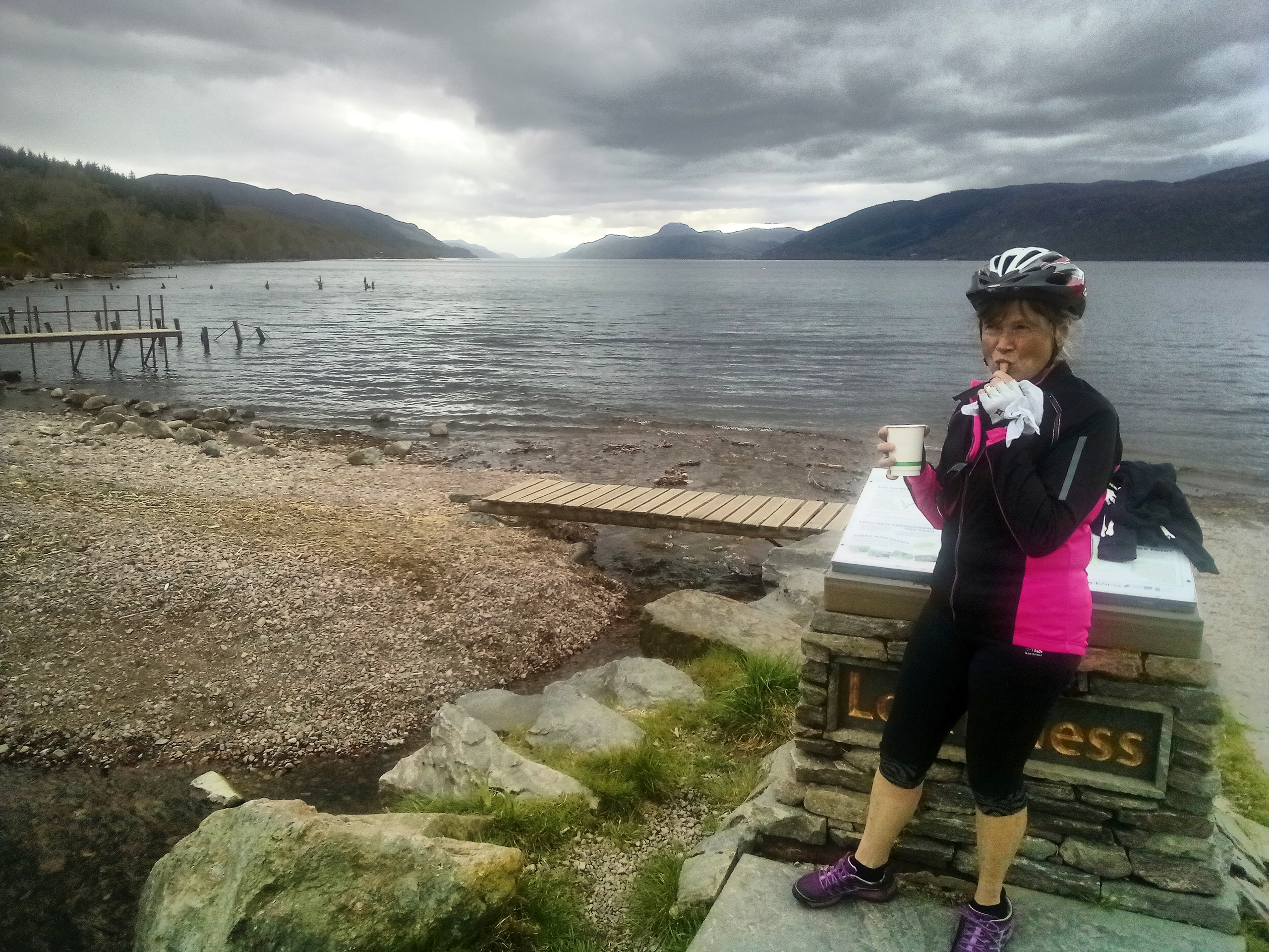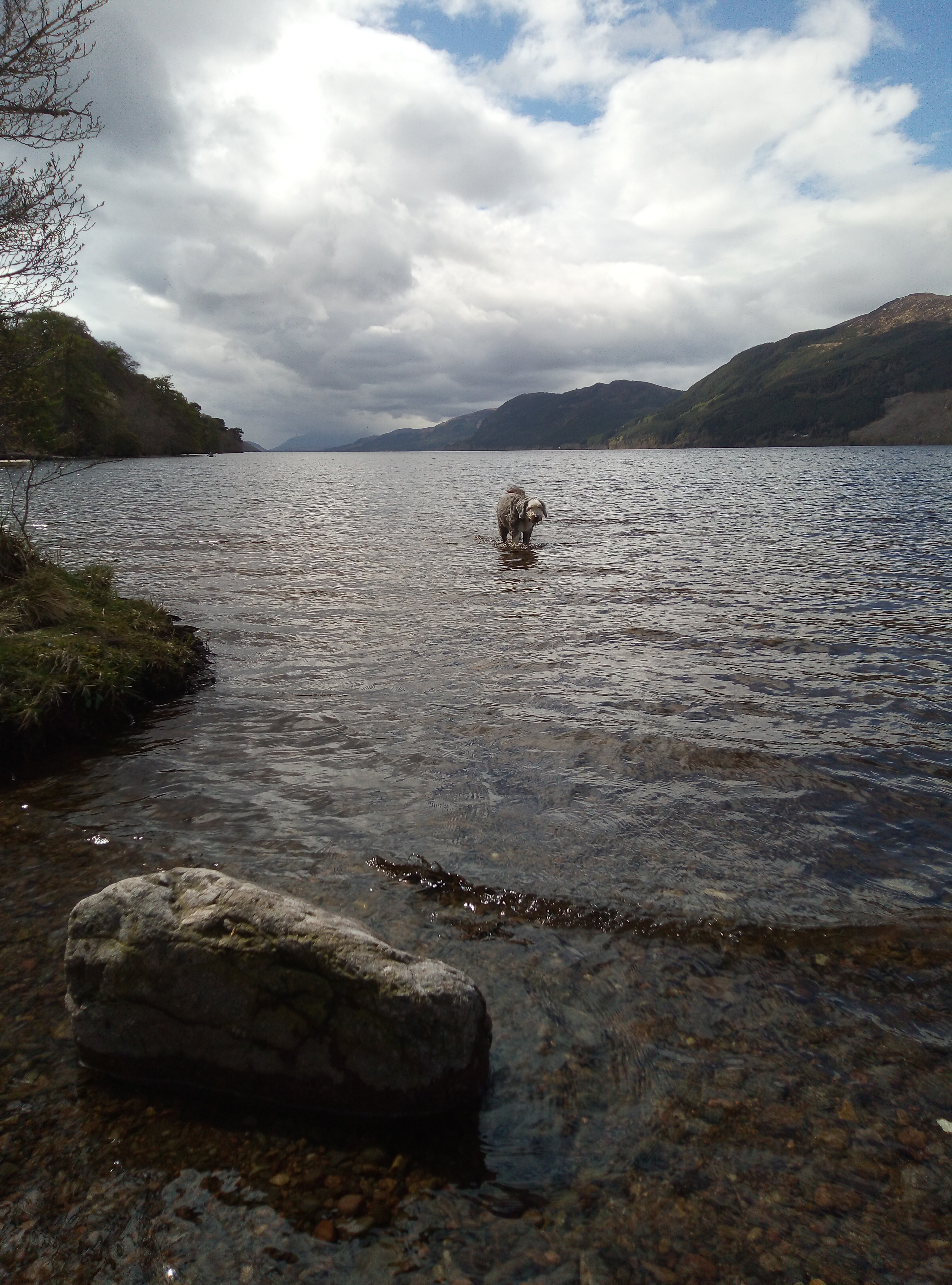 A fine morning so we decided that Misty needed another outing. We followed the squirrel route (why it was called this we do not know as we didn’t see any kind of squirrel) up and passed the Foyers falls which were very unimpressive with so little water in. We were impressed however by the ultra marathon runners who passed us. We arrived at the top road to coffee and cake as we watched more runners passing by. We couldn’t sit drinking coffee all day (although we did get some good advice about climbing Monroes and the weather up north) so we made a move and headed back down through the forest with more runners passing us. Misty got the smell of Loch Ness and we could not hold her back down hill. All she wanted was a cooling plodge in the water.