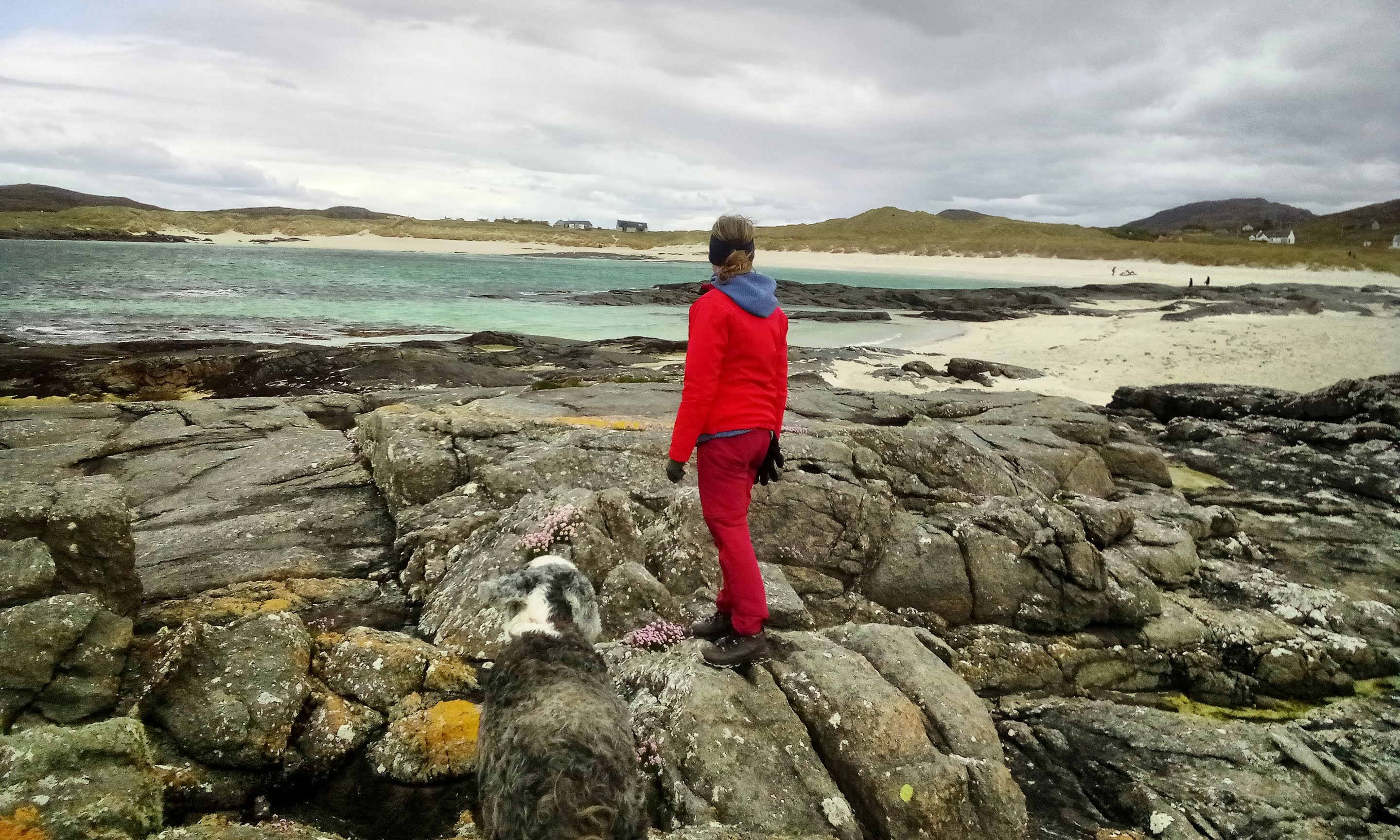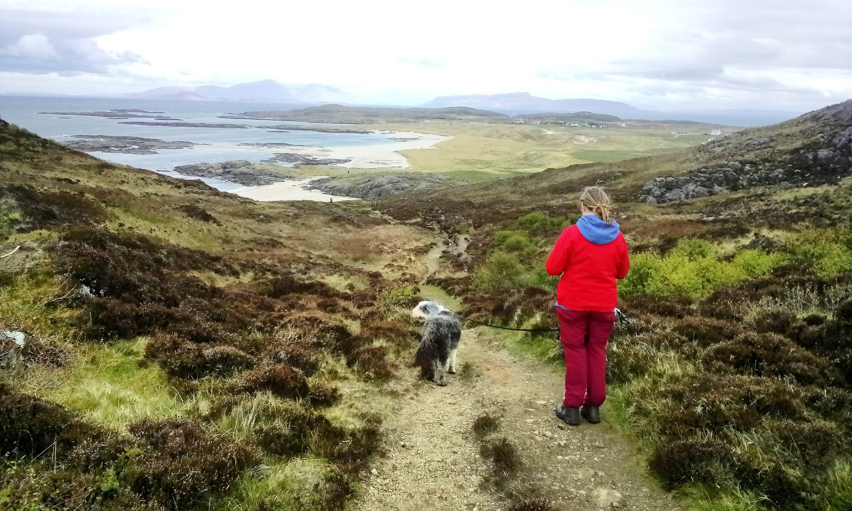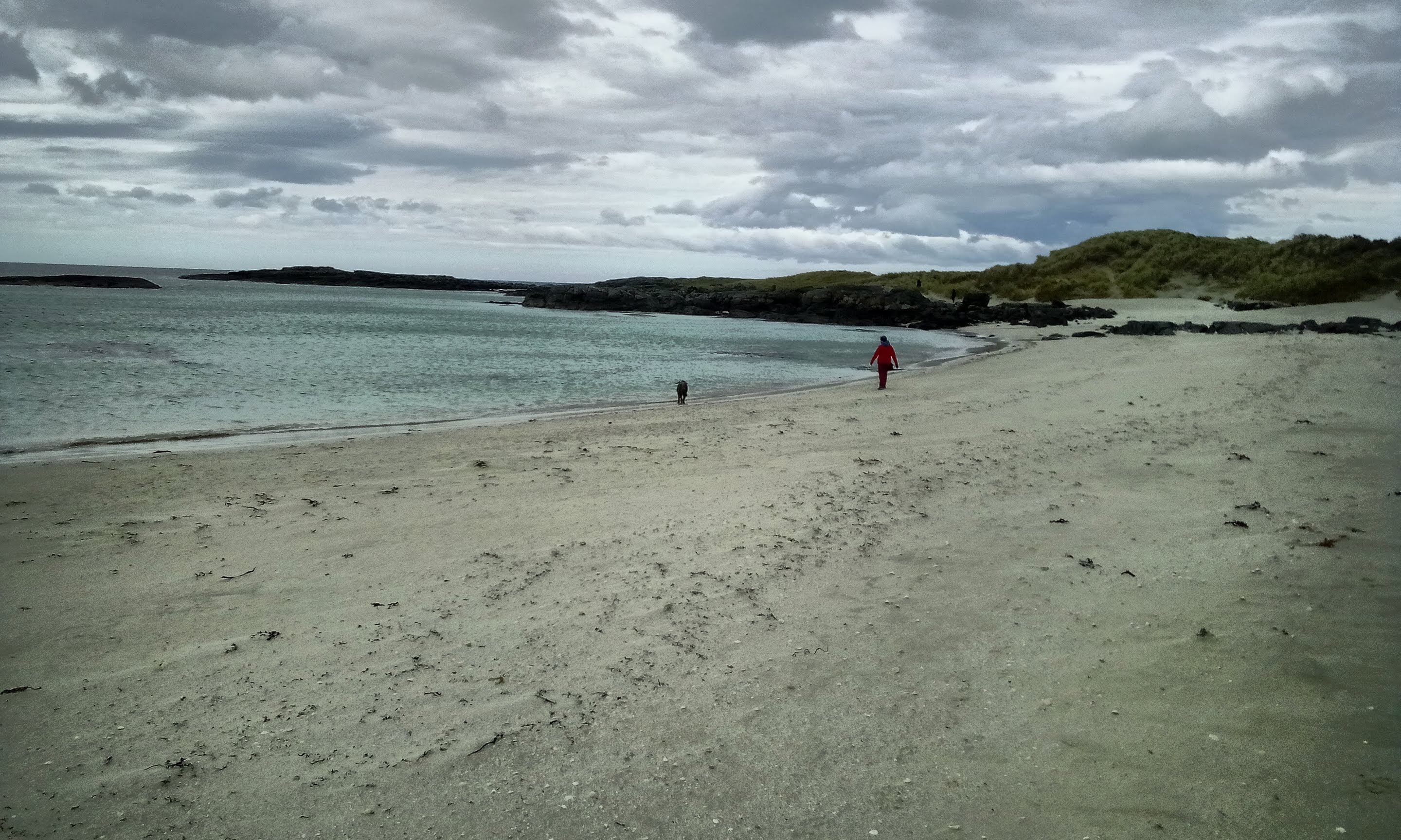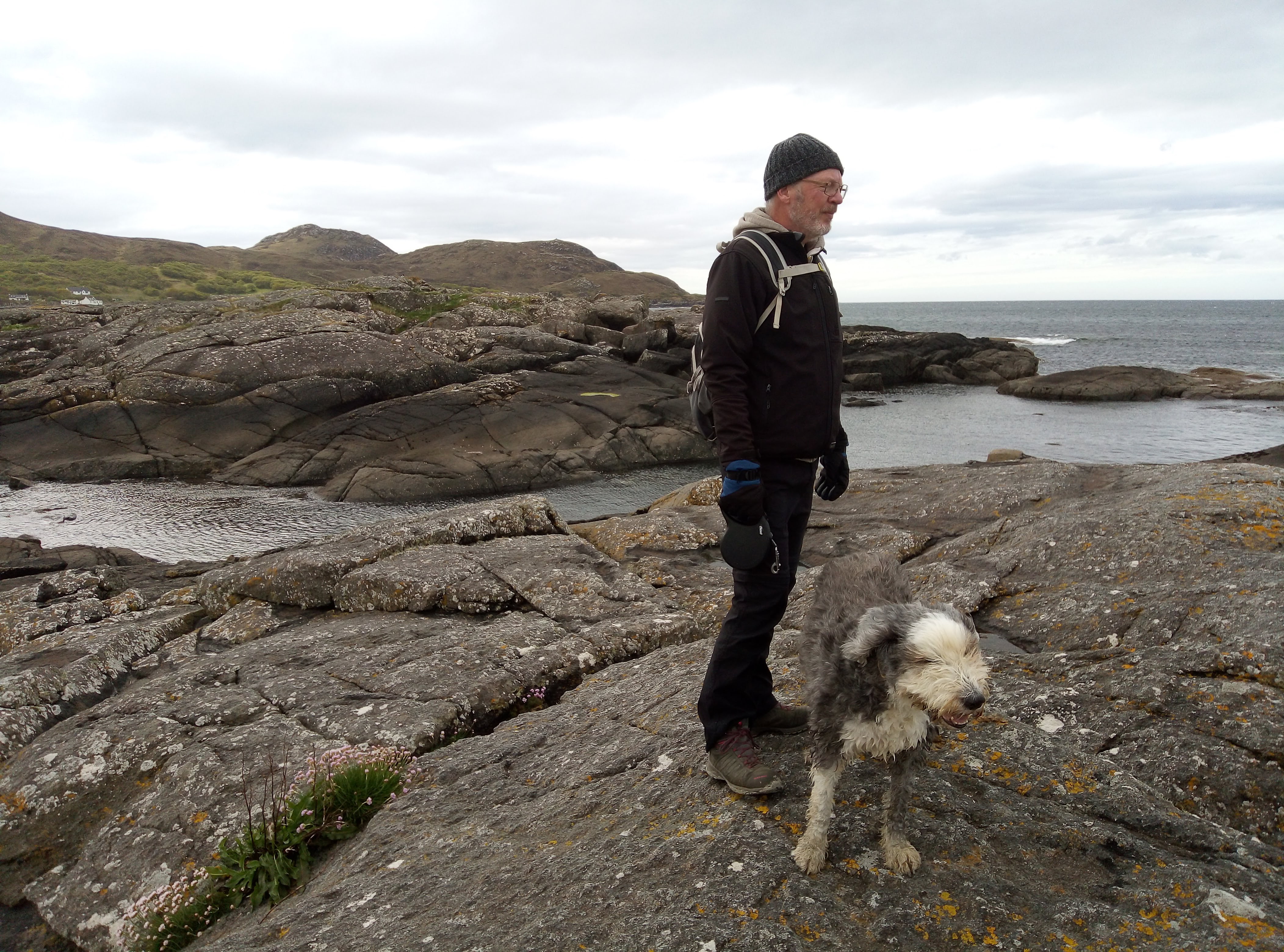 Changed our minds again, we’re nothing but flexible. Neither of us have ever been to the Ardnamurchan peninsula, so we thought we would go. Back to Tobermory we went and caught the 11.00 ferry to Kilchoan. After a quick croissant and coffee at the puffin cafe we took a quick left and went to Sanna Beach, the most westerly point on the mainland. Misty joined us on the 3 mile walk there and back. We met Sammy the seal and Ollie the oystercatcher and saw another eagle. Getting blazè about wildlife now!! Barbara picked up a few shells before we headed back to the van for a late lunch and to get out of the blustery wind.