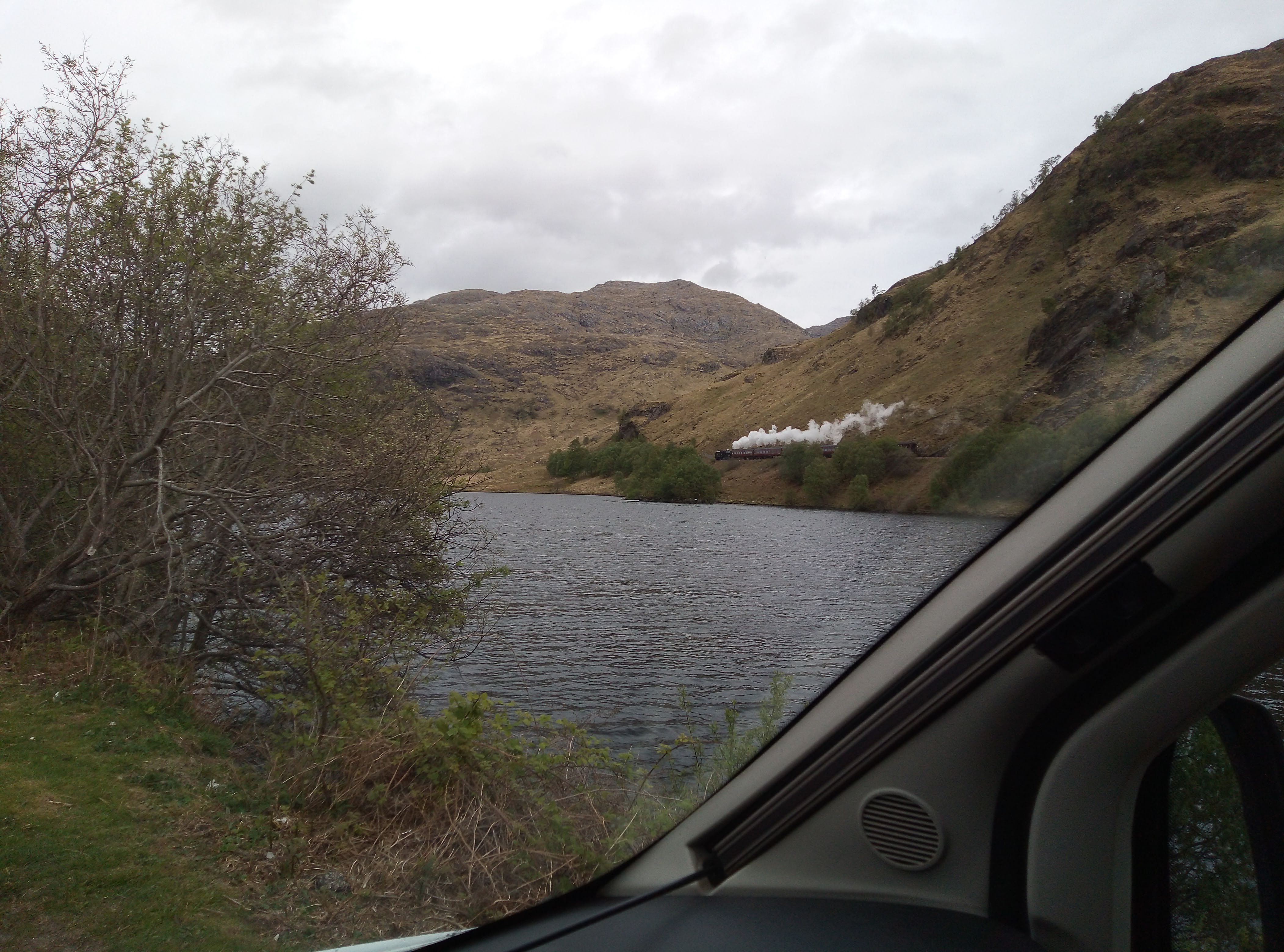 We had actually planned our route to our overnight stop but paased by loads of parked up campervans and motorhomes so we kept driving to Glen Coe. On the way we stopped for coffee in a lay-by and heard a most peculiar noise, was it a plane? Was it a boat? No it was the Jacobite steam train returning to Fort William on the opposite side of the loch. If we had been 7 miles further up the road we would have seen it steaming over the Glenfinnan viaduct! (Jane, Olivia and Amelia called to say hi during the journey.)