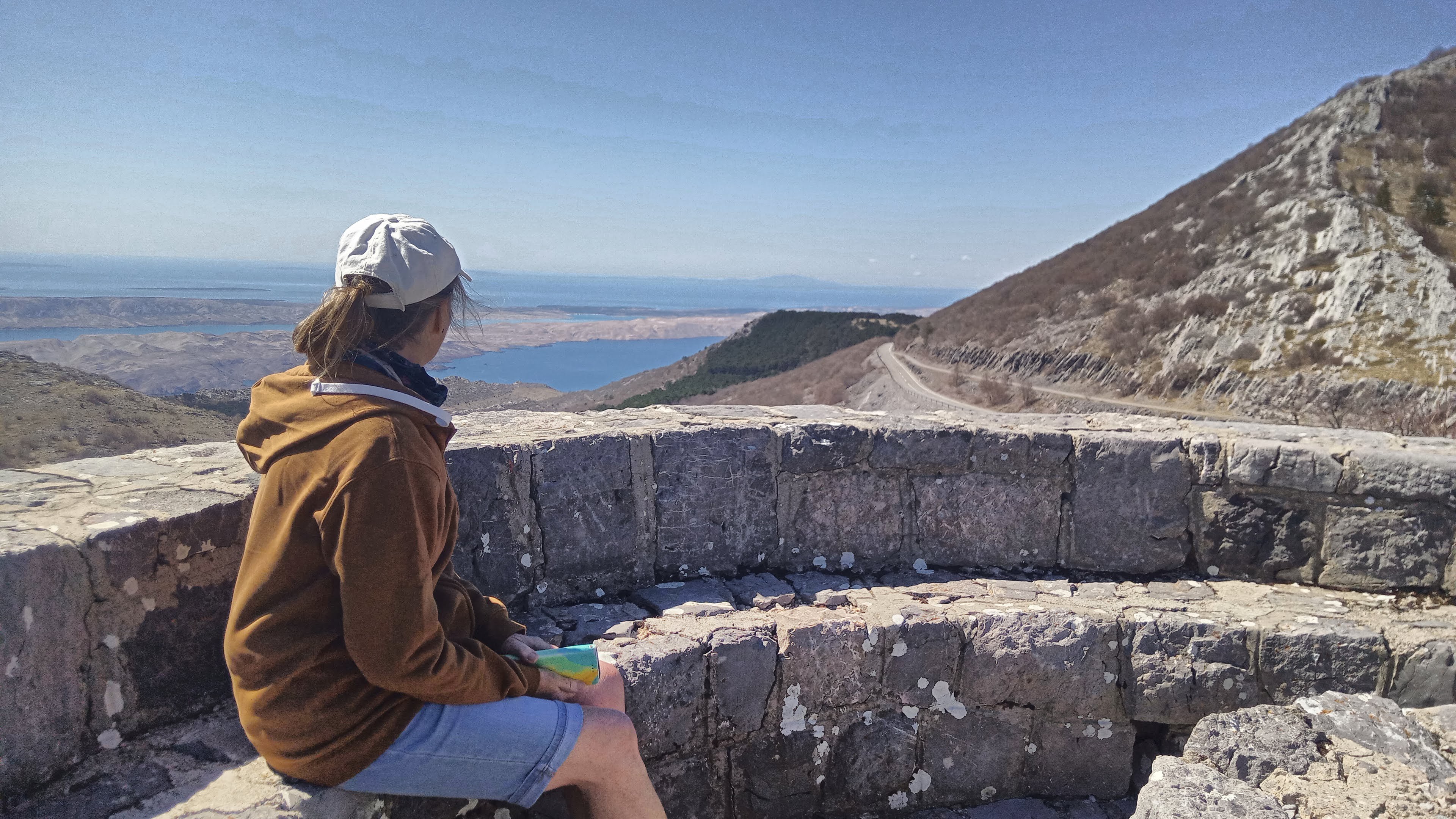We left quiet little Vrbnik in the sunshine and drove back across the bridge off the island of Krk. The coastal drive between Krk and Zadar was breathtaking and eating packed lunch watching the sea was equally so. Ian’s diversion up a hill was 9 mile long and serpentinous ( road signs all mentioned serpentine 😆)