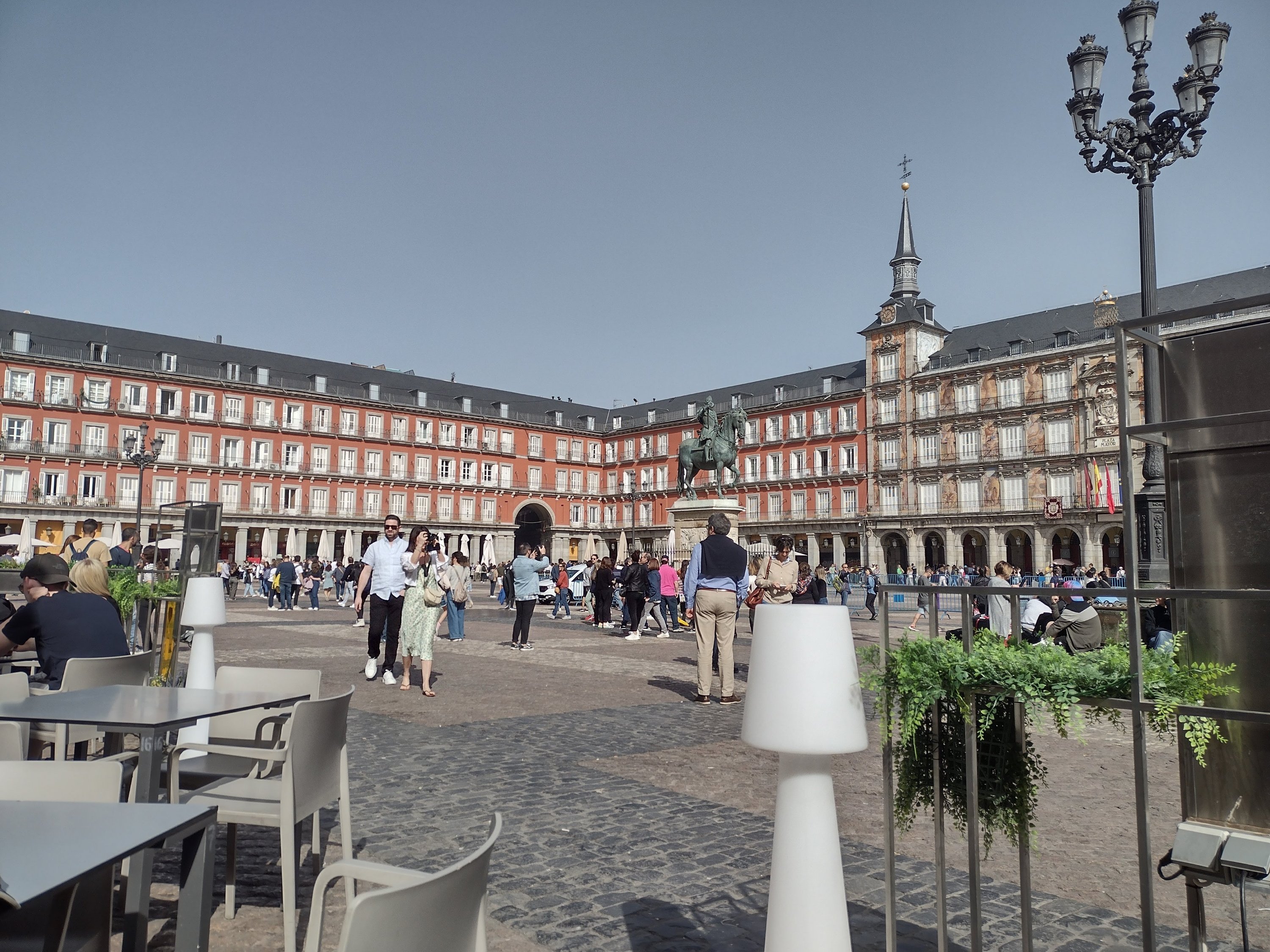The bus from Bustarviego took just over an hour after which we caught the metro to the Plaza Mayor, only 18 stops. After this journey we needed coffee so sat in a cafe in the plaza watching the world. We were expecting music to celebrate the end of Easter but it never happened so we moved on.