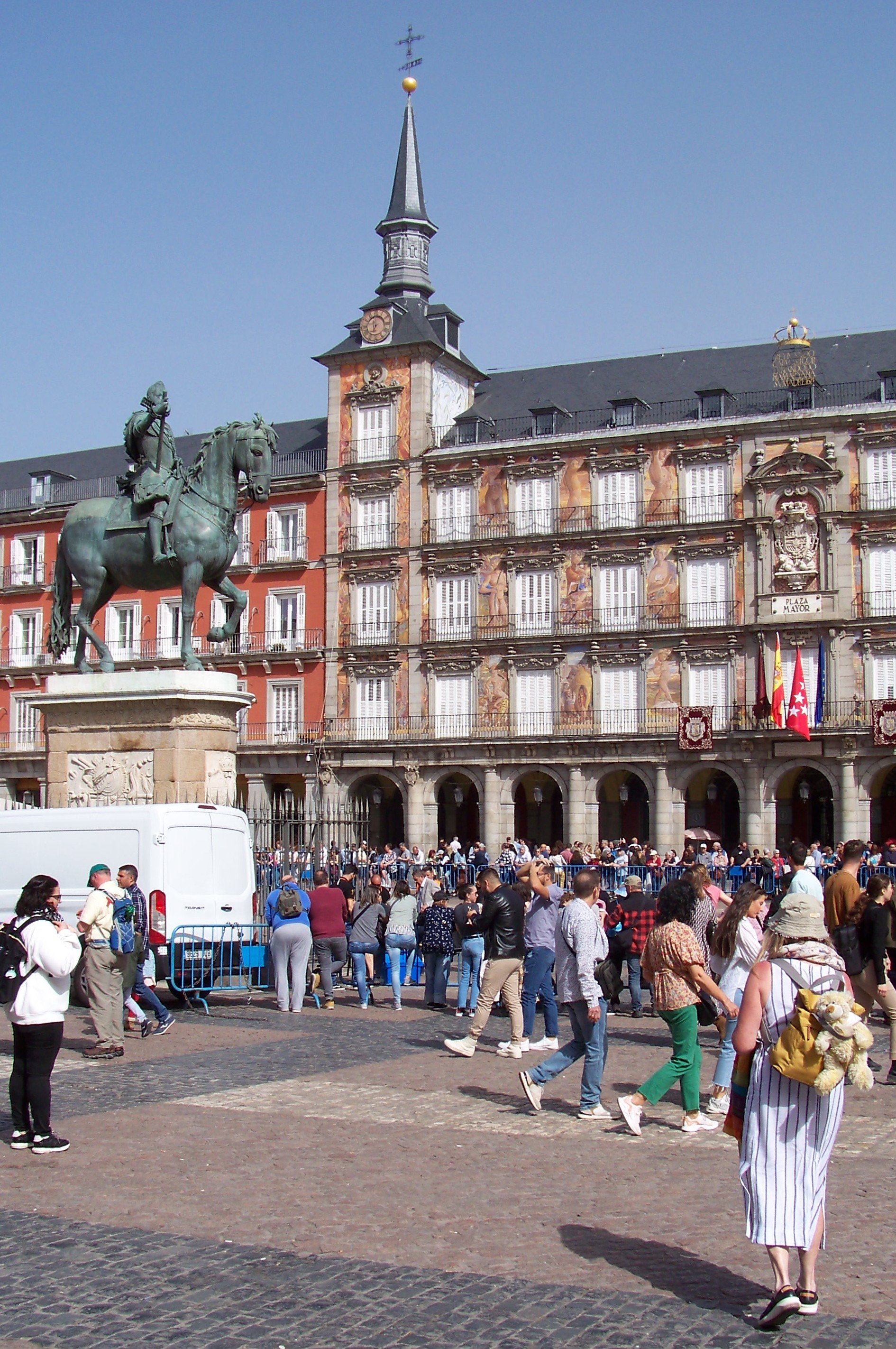 The bus from Bustarviego took just over an hour after which we caught the metro to the Plaza Mayor, only 18 stops. After this journey we needed coffee so sat in a cafe in the plaza watching the world. We were expecting music to celebrate the end of Easter but it never happened so we moved on.