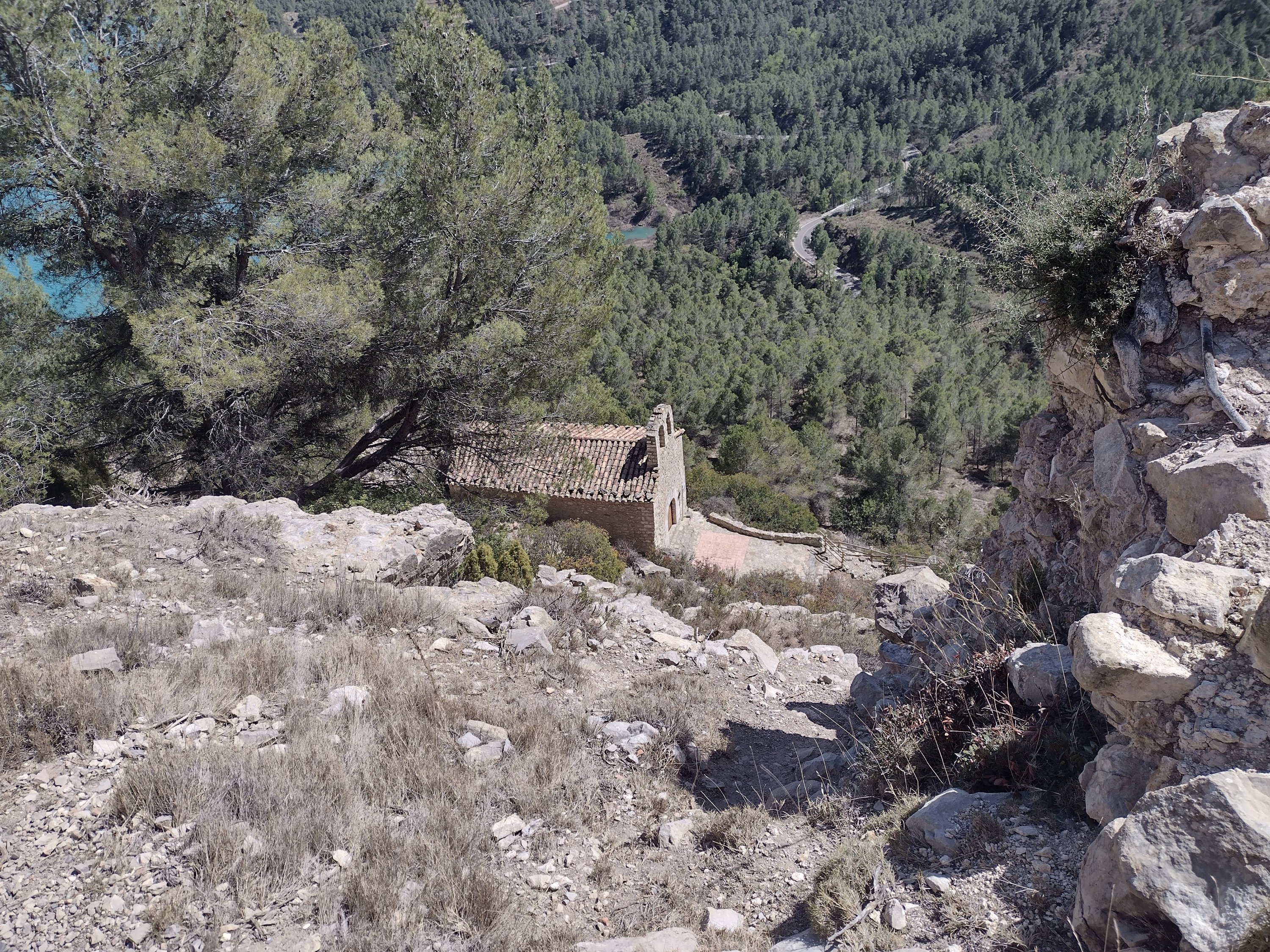 We set out for the hot springs of Montanejos about 1 1/2 hours from our apartment. As we got closer it became apparent that there were hordes of people there. It was 26° after all. We carried on driving and found a lovely rock, above it all, for lunch. A fairly relaxed affair until we spotted a castle on a hill. Before we knew it we were walking up the track, not too arduous, and well signposted. The first thing we found was the Ermita de Los Angeles, a little Chapel just below the craggy outcrop. Shut but we were able to take a sneaky photo through the window.