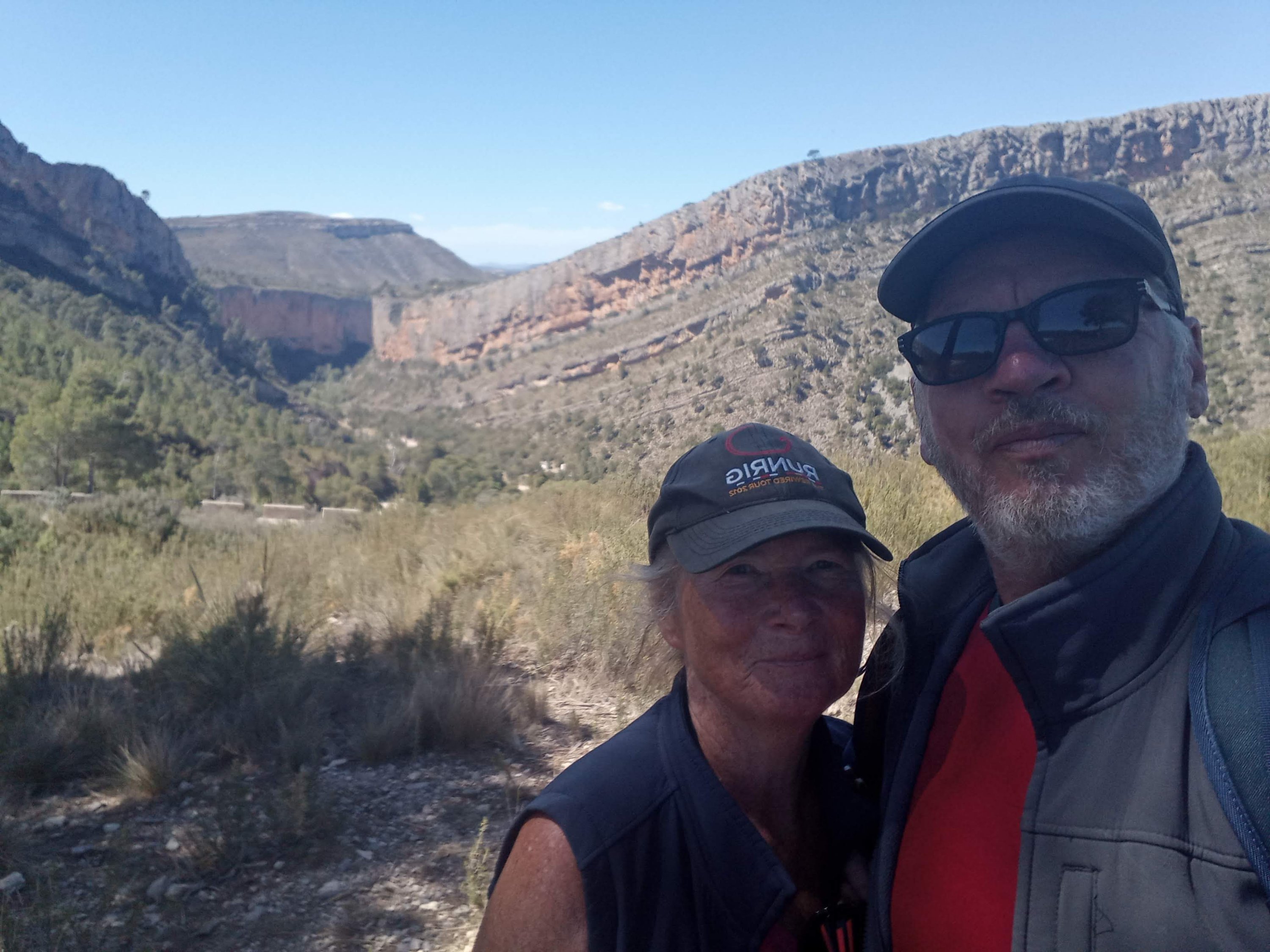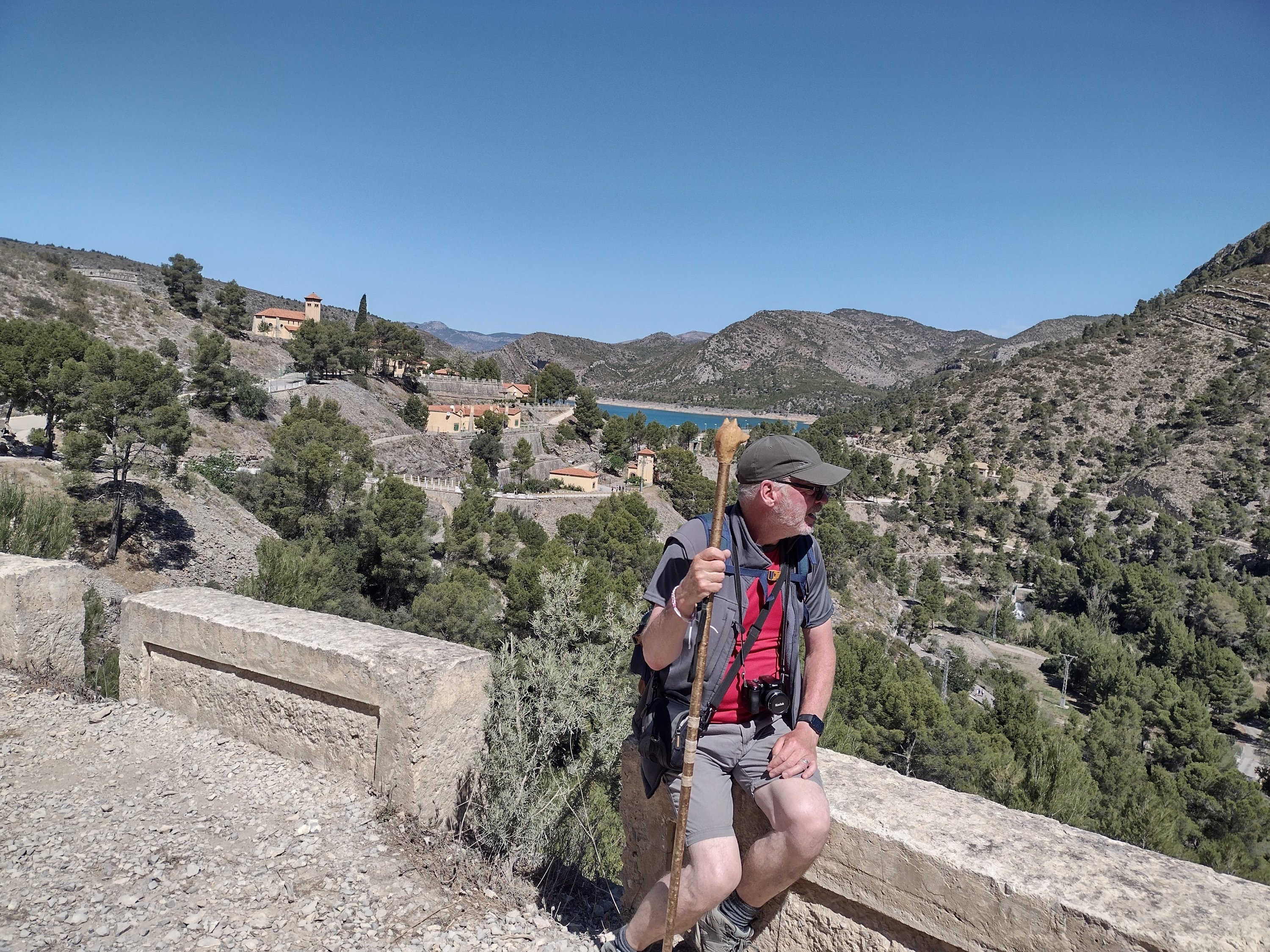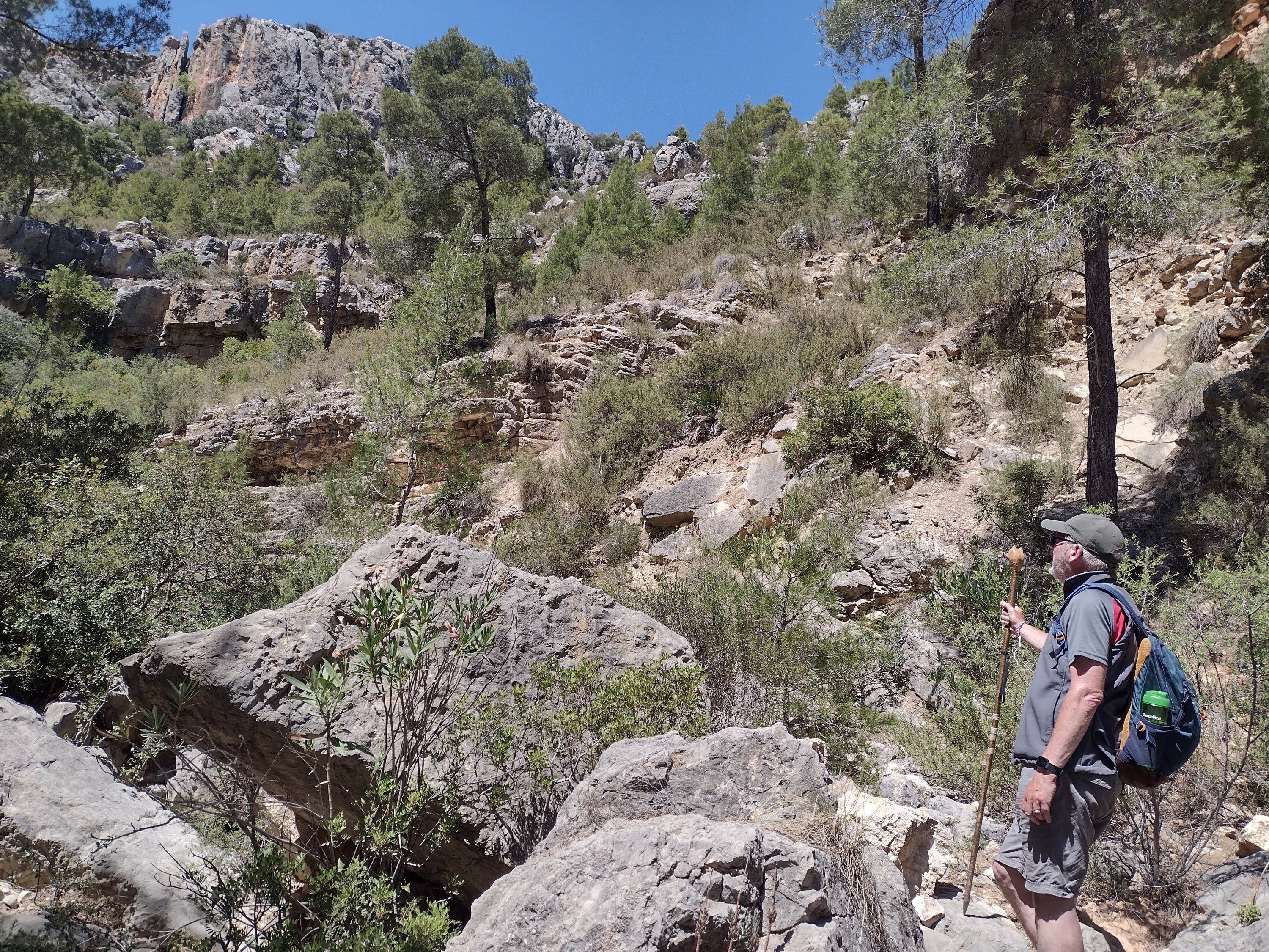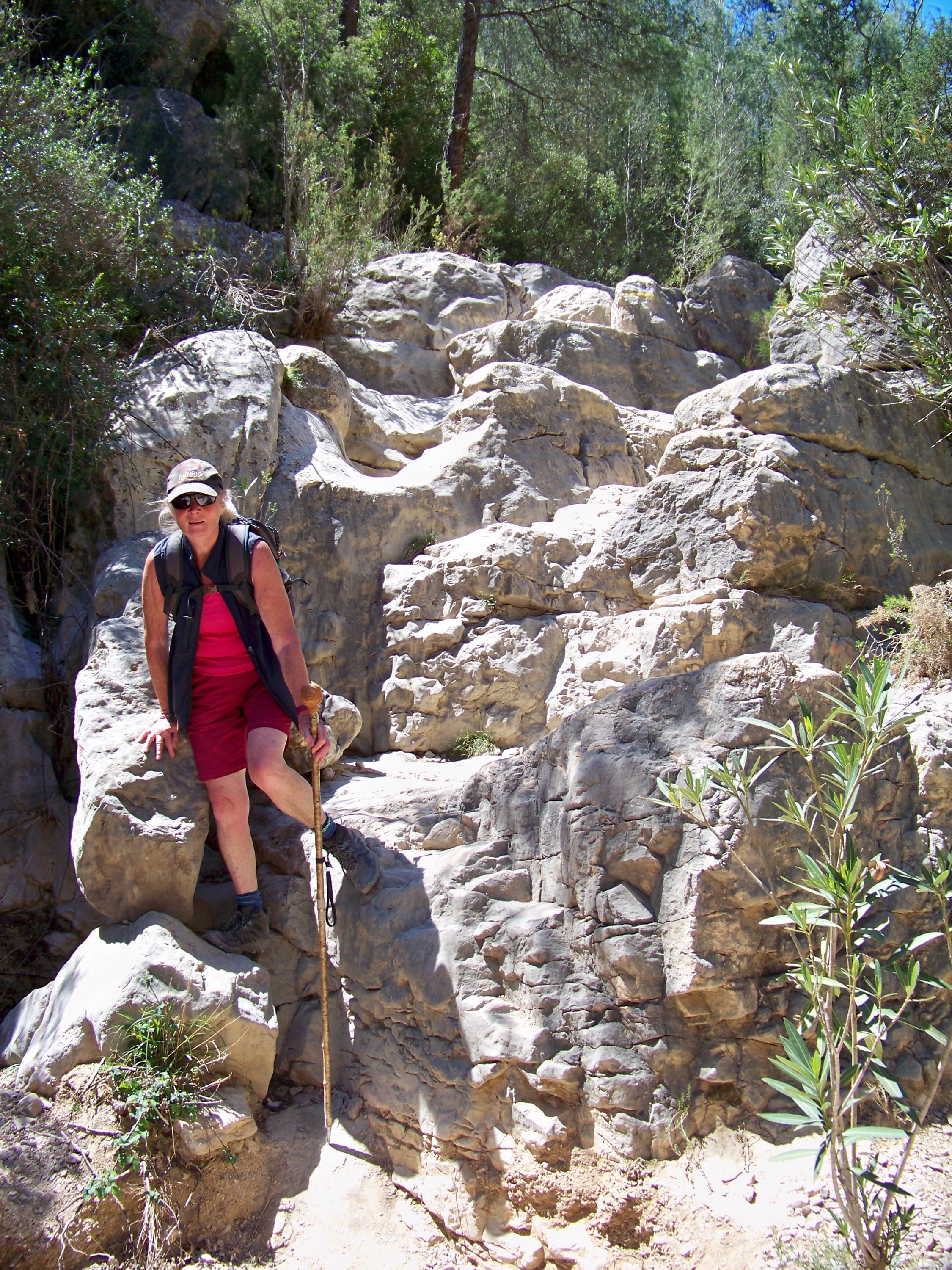 The weather was glorious, the walking good, so had lunch overlooking the reservoir, Sixty enjoyed the shade. The wide track soon disappeared into a regular walking path which was actually a dry stream bed. We were looking for the signs to the cave paintings, but as we are used to errors in distances given on Spanish signs, we kept our eyes open, but still walked farther than expected. Eventually we found the sign and started hunting for the cave. This is where our canyoning without water, and paddle, started. We headed down a very steep, boulder filled dry river bed in a gorge which would, in its day, have had some wonderful water falls. True to form we kept going! Then the moment hit us that we might have missed the cave, or if we hadn’t someone was having a laugh! So with lots of scrambling, pushing and pulling each other back up the dry waterfalls and boulders, we rejoined the main path. Quite disappointed we continued on our way only to find an information board pointing right at the cave across the gorge. Back again for the 3rd time we found the cave paintings up a rickety old ladder and some broken steps. Nothing too startling but they were prehistoric.