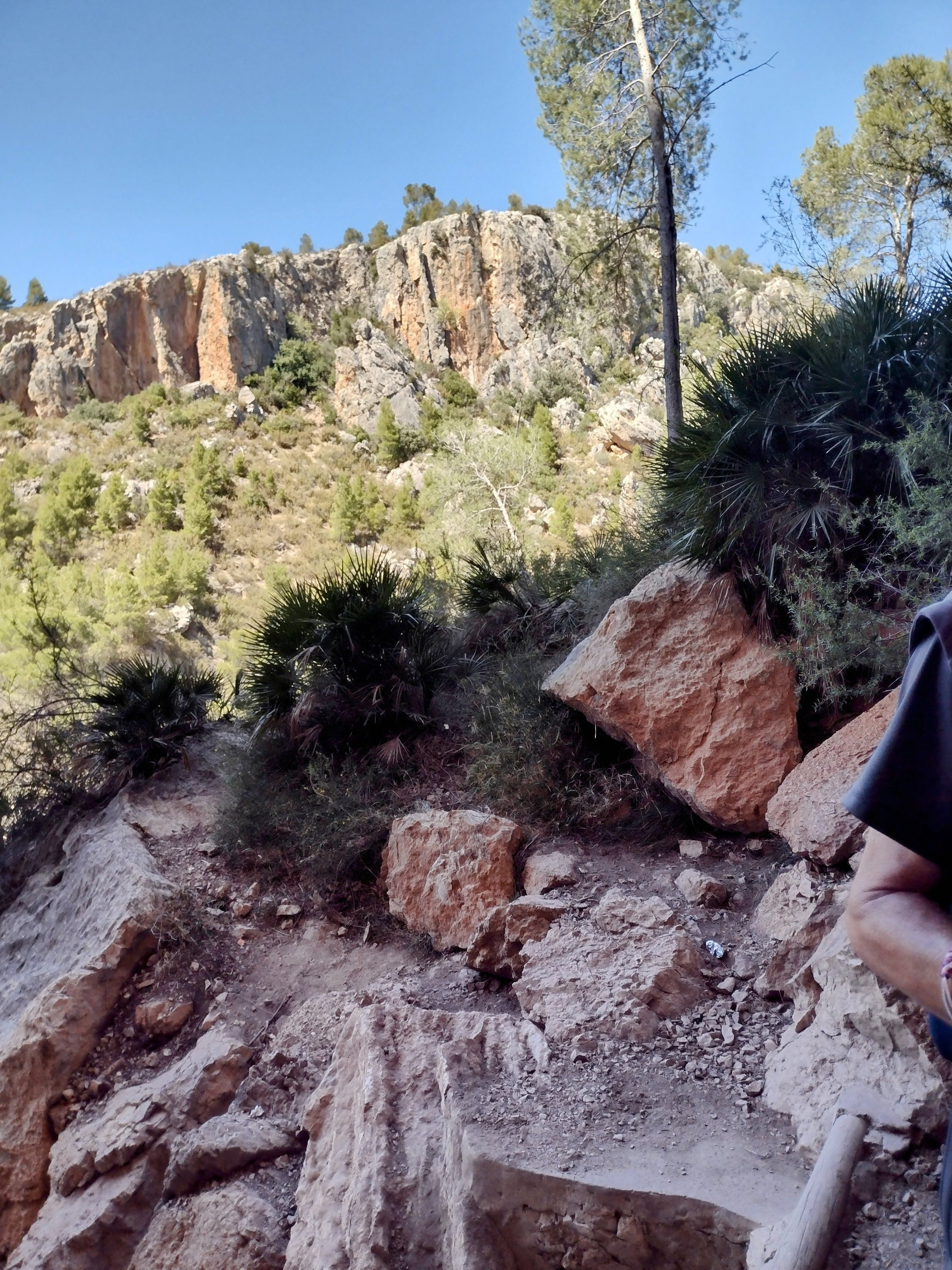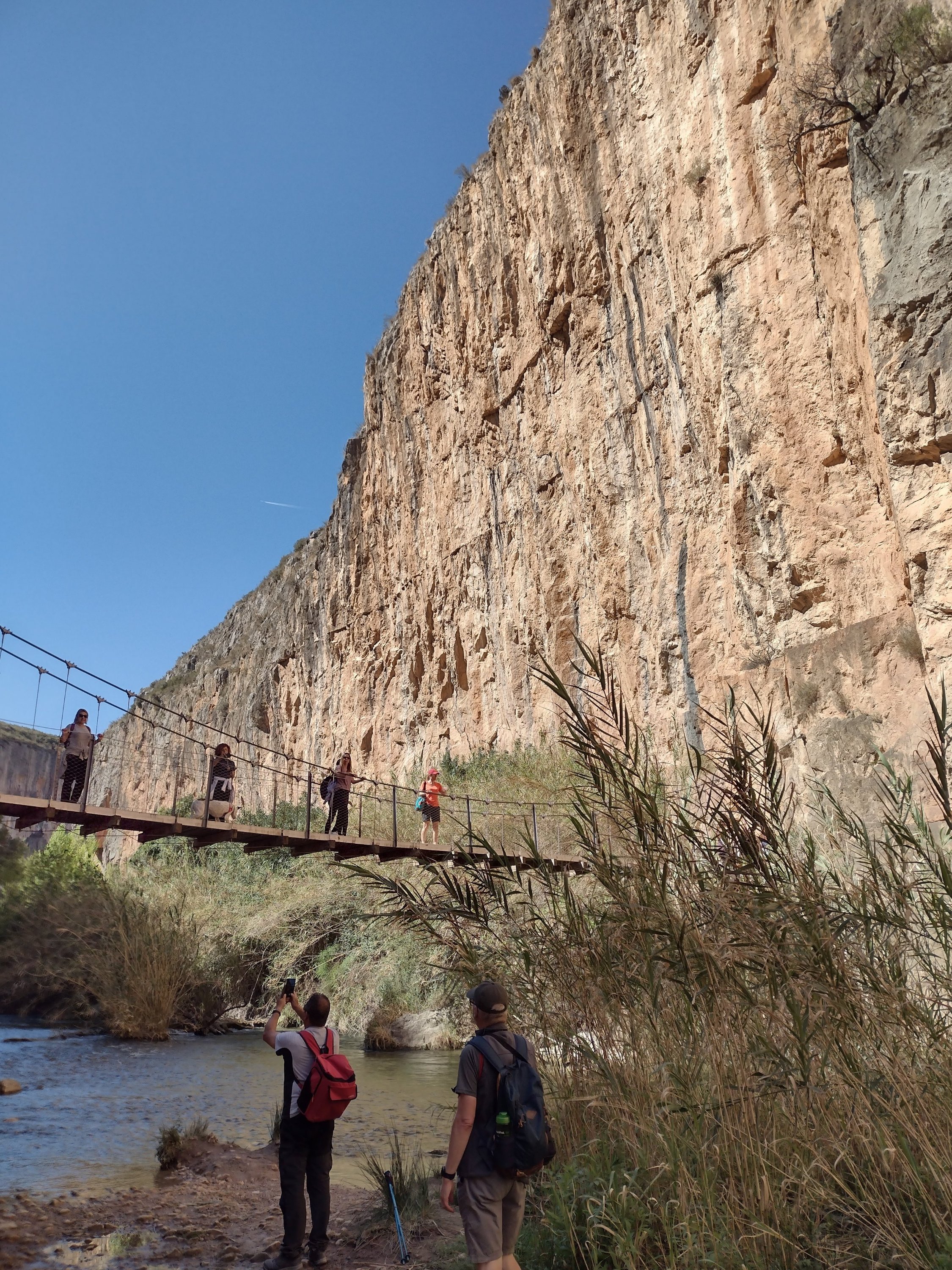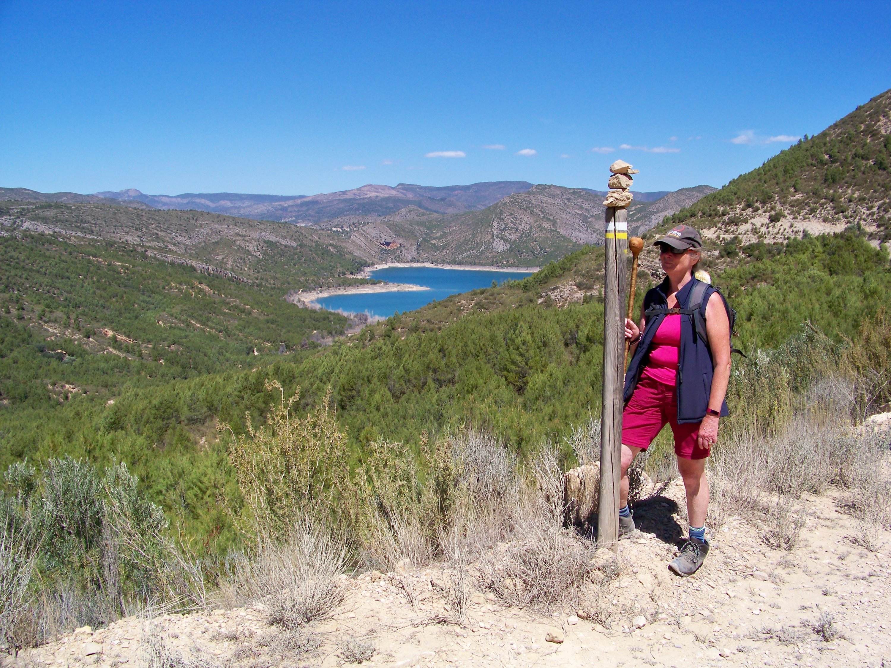 The weather was glorious, the walking good, so had lunch overlooking the reservoir, Sixty enjoyed the shade. The wide track soon disappeared into a regular walking path which was actually a dry stream bed. We were looking for the signs to the cave paintings, but as we are used to errors in distances given on Spanish signs, we kept our eyes open, but still walked farther than expected. Eventually we found the sign and started hunting for the cave. This is where our canyoning without water, and paddle, started. We headed down a very steep, boulder filled dry river bed in a gorge which would, in its day, have had some wonderful water falls. True to form we kept going! Then the moment hit us that we might have missed the cave, or if we hadn’t someone was having a laugh! So with lots of scrambling, pushing and pulling each other back up the dry waterfalls and boulders, we rejoined the main path. Quite disappointed we continued on our way only to find an information board pointing right at the cave across the gorge. Back again for the 3rd time we found the cave paintings up a rickety old ladder and some broken steps. Nothing too startling but they were prehistoric.