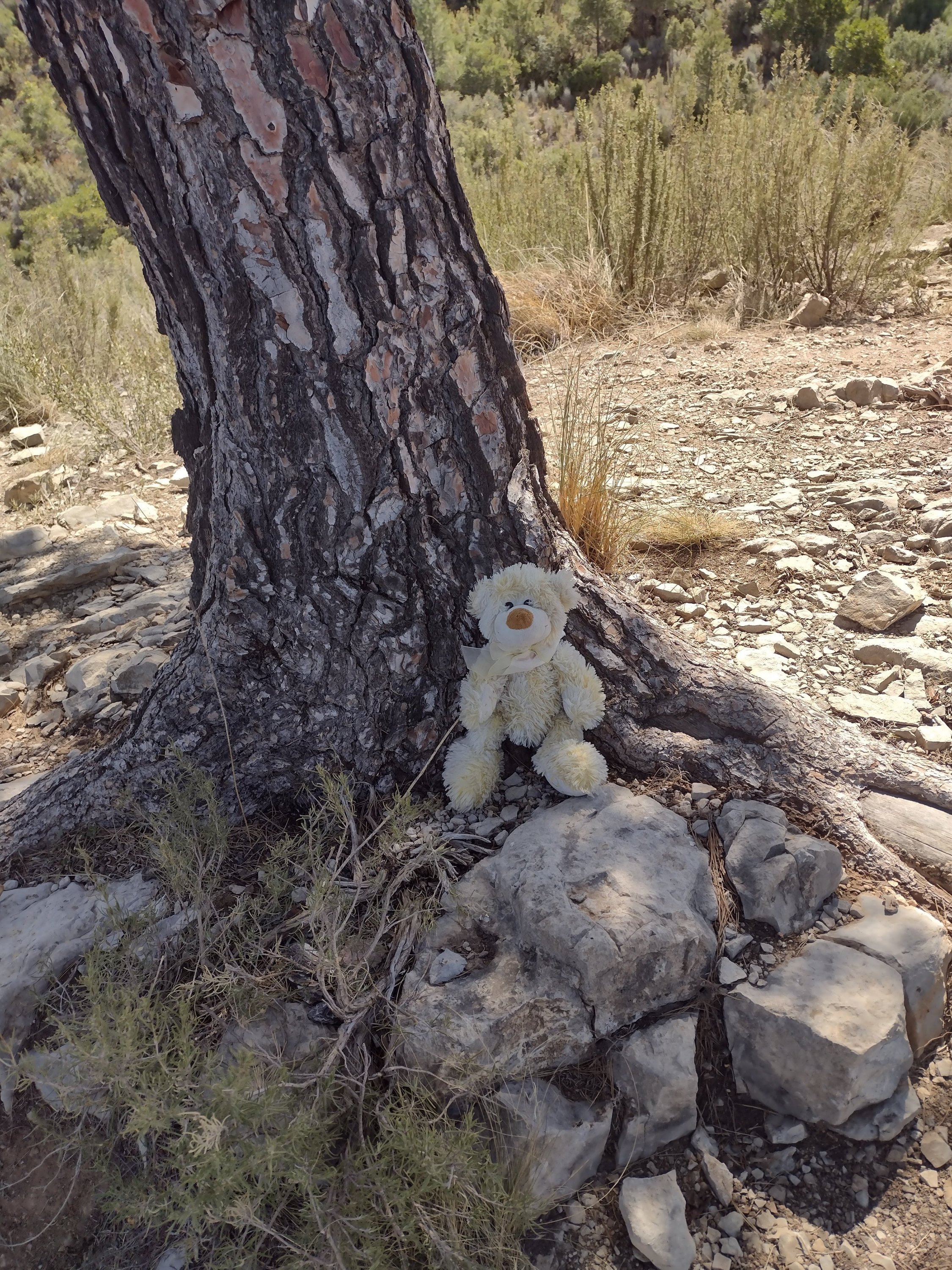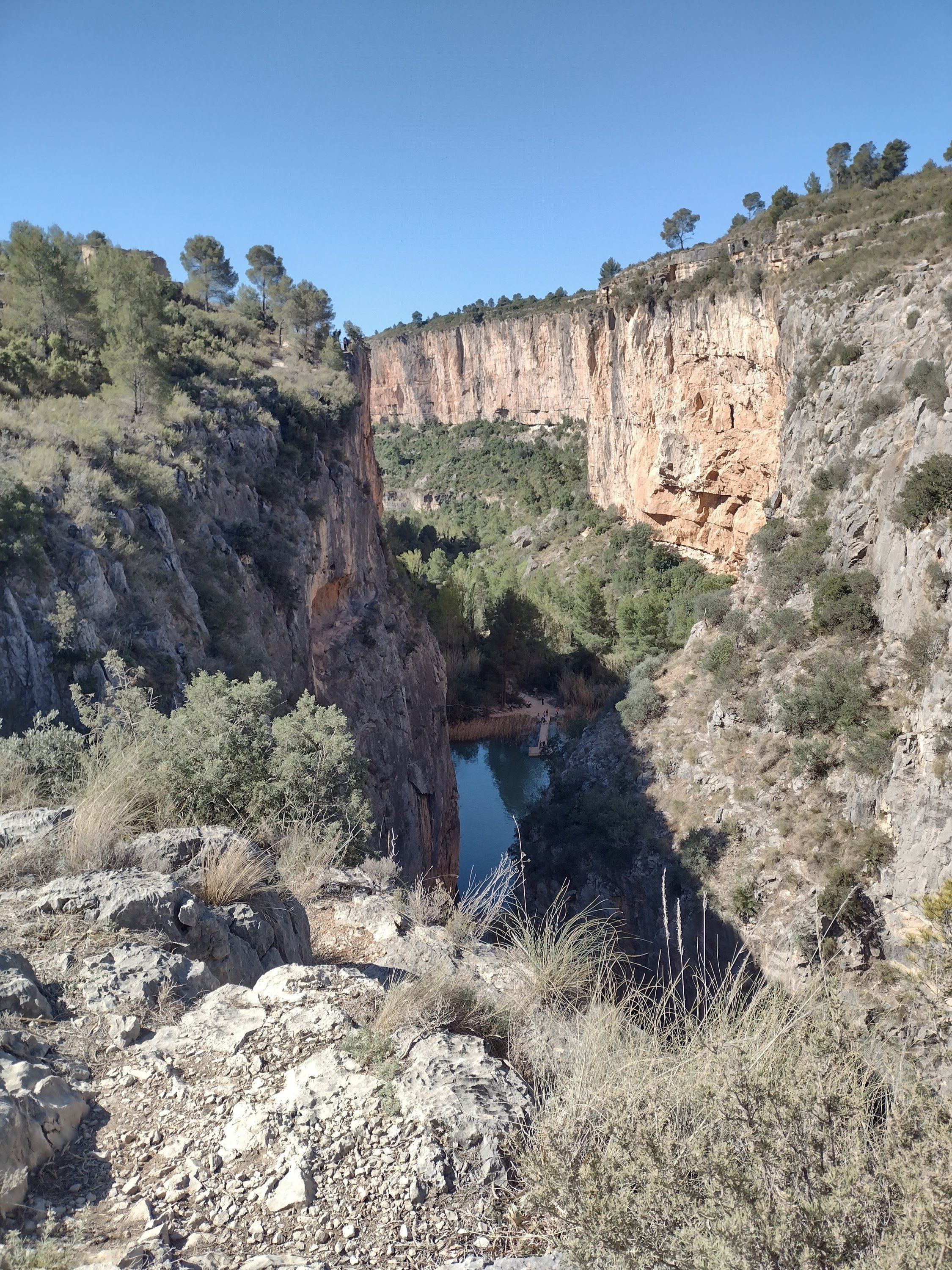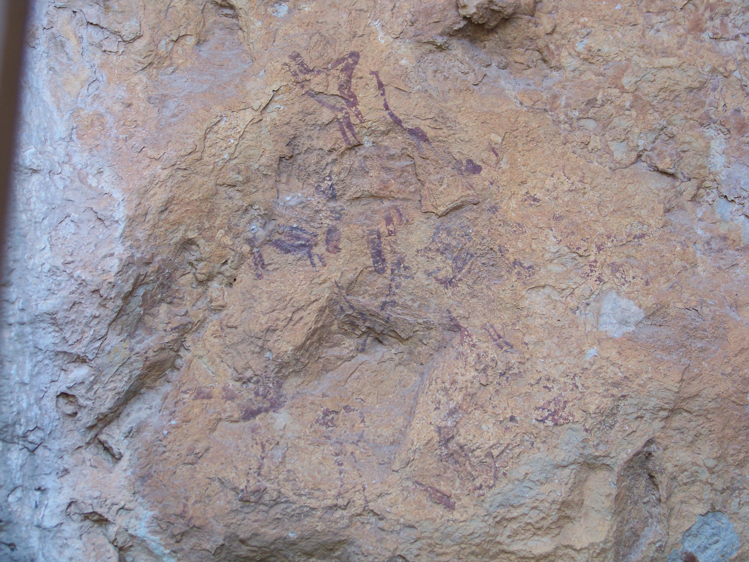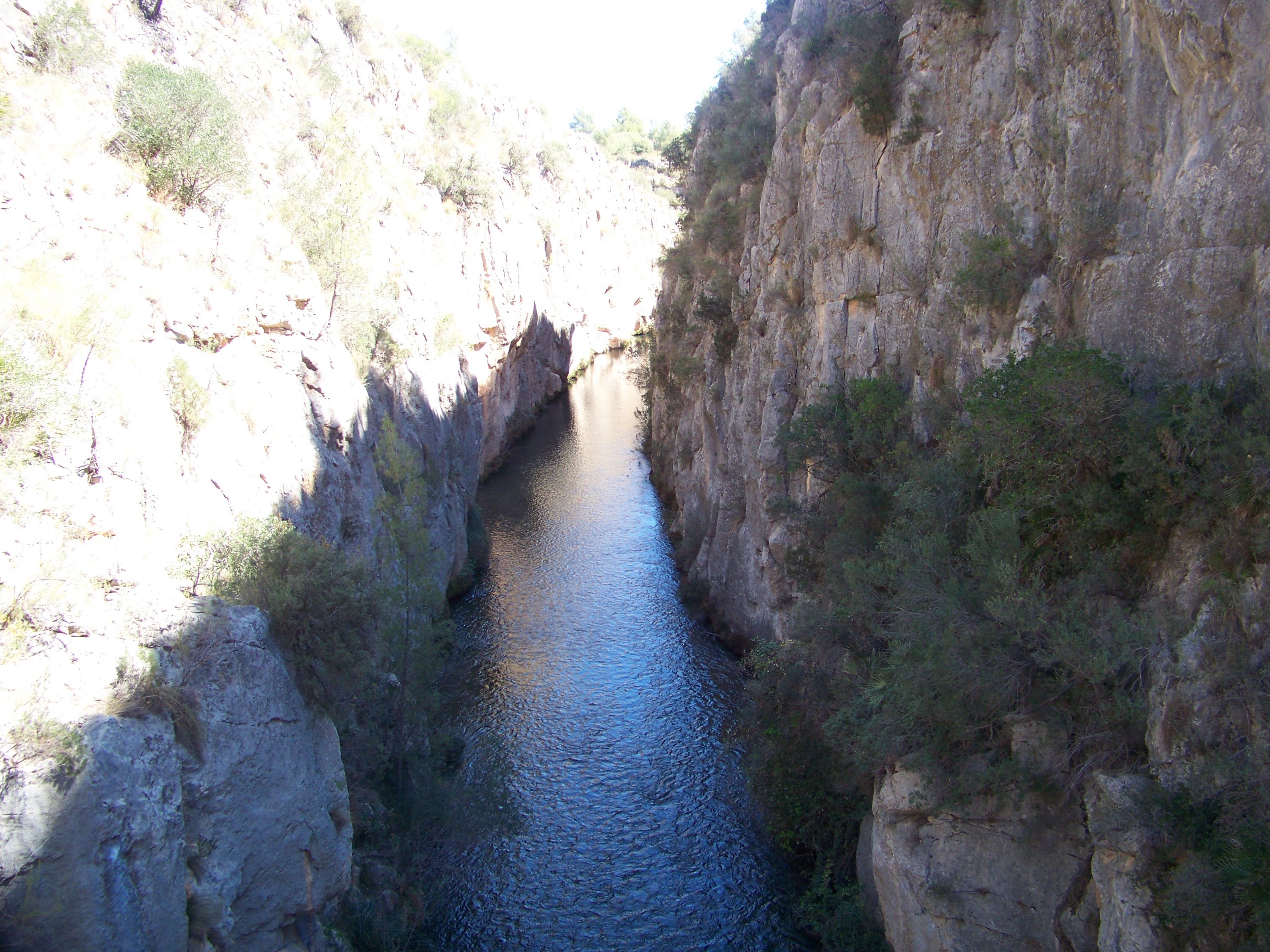 The weather was glorious, the walking good, so had lunch overlooking the reservoir, Sixty enjoyed the shade. The wide track soon disappeared into a regular walking path which was actually a dry stream bed. We were looking for the signs to the cave paintings, but as we are used to errors in distances given on Spanish signs, we kept our eyes open, but still walked farther than expected. Eventually we found the sign and started hunting for the cave. This is where our canyoning without water, and paddle, started. We headed down a very steep, boulder filled dry river bed in a gorge which would, in its day, have had some wonderful water falls. True to form we kept going! Then the moment hit us that we might have missed the cave, or if we hadn’t someone was having a laugh! So with lots of scrambling, pushing and pulling each other back up the dry waterfalls and boulders, we rejoined the main path. Quite disappointed we continued on our way only to find an information board pointing right at the cave across the gorge. Back again for the 3rd time we found the cave paintings up a rickety old ladder and some broken steps. Nothing too startling but they were prehistoric.