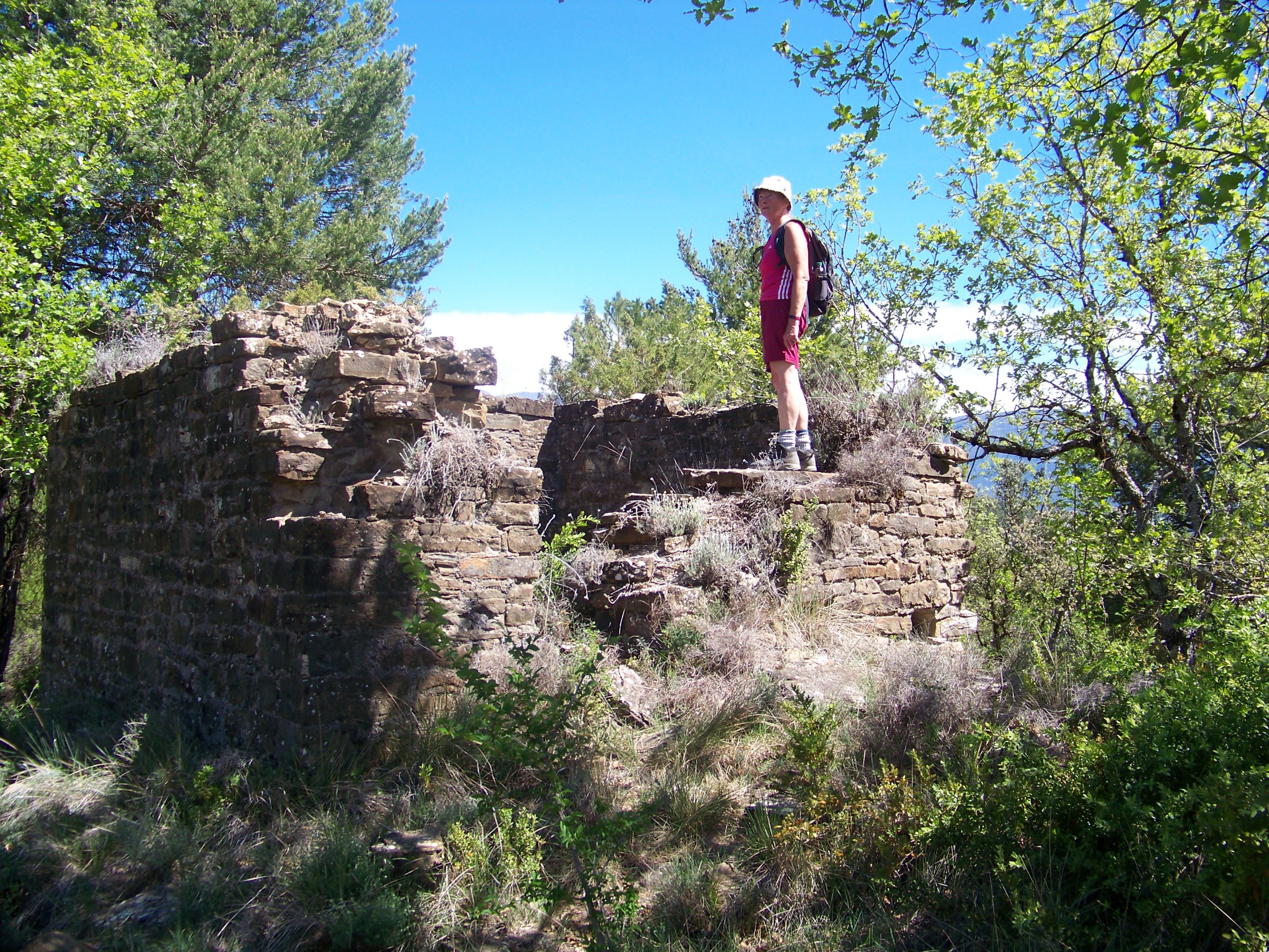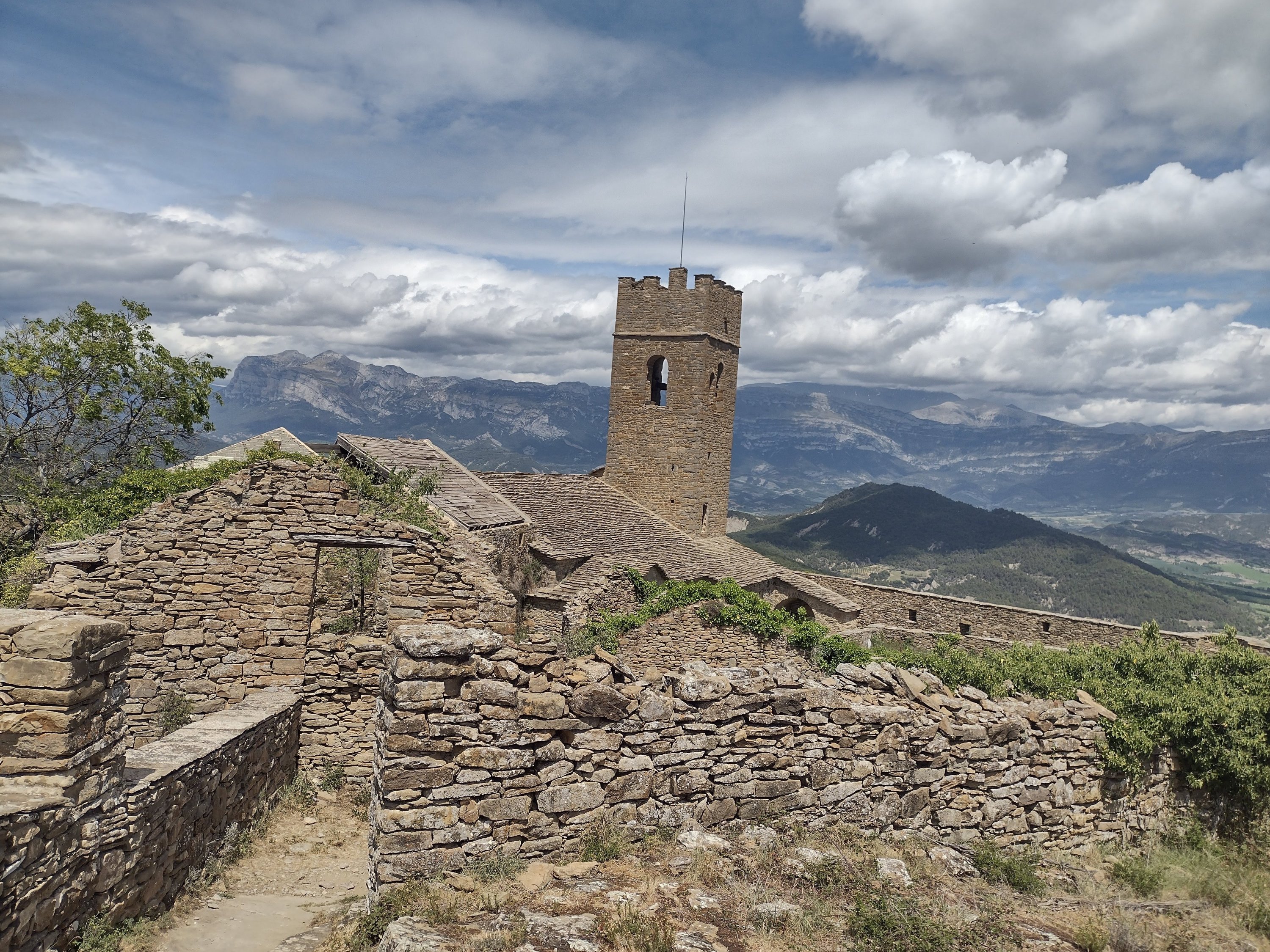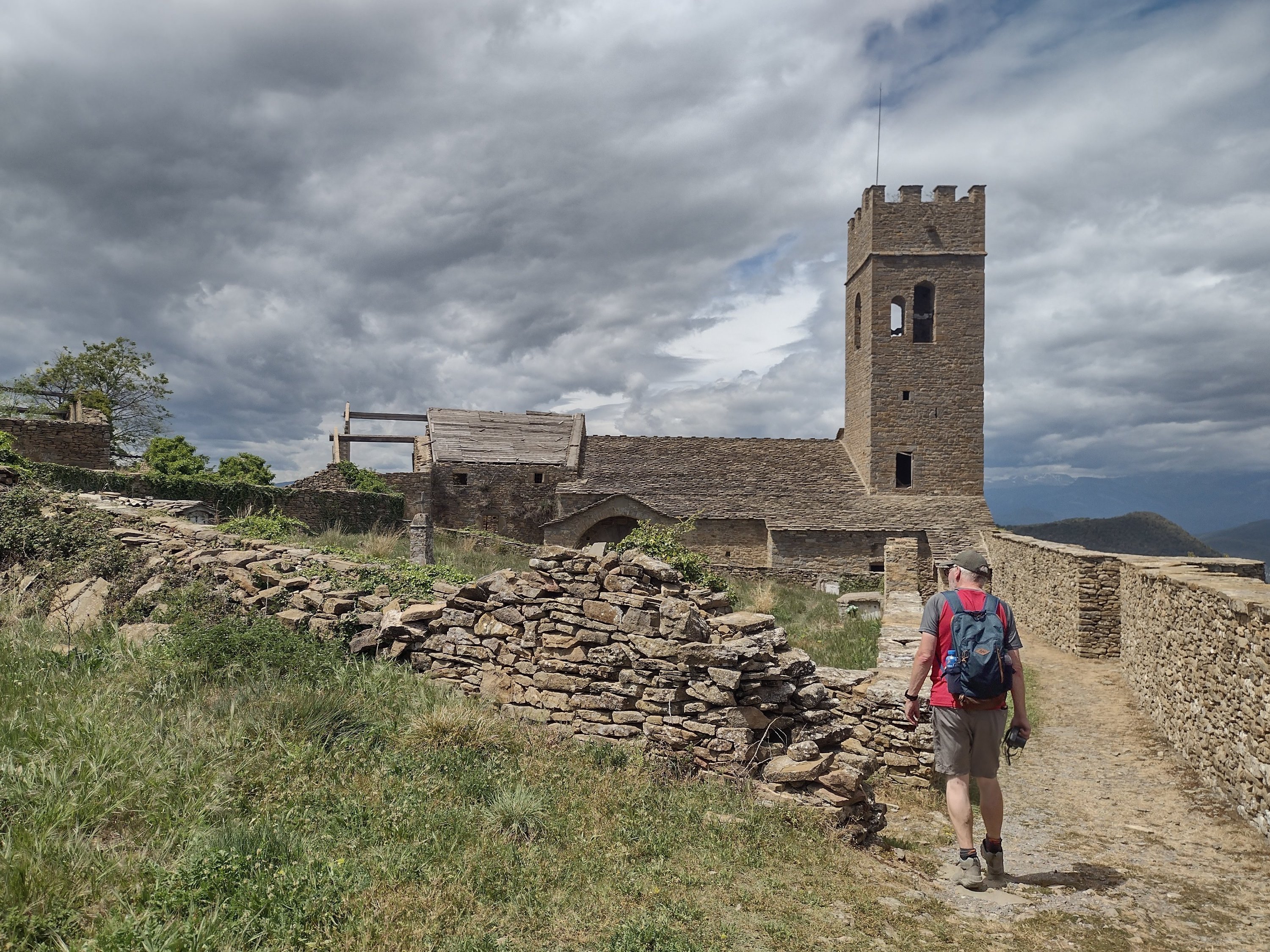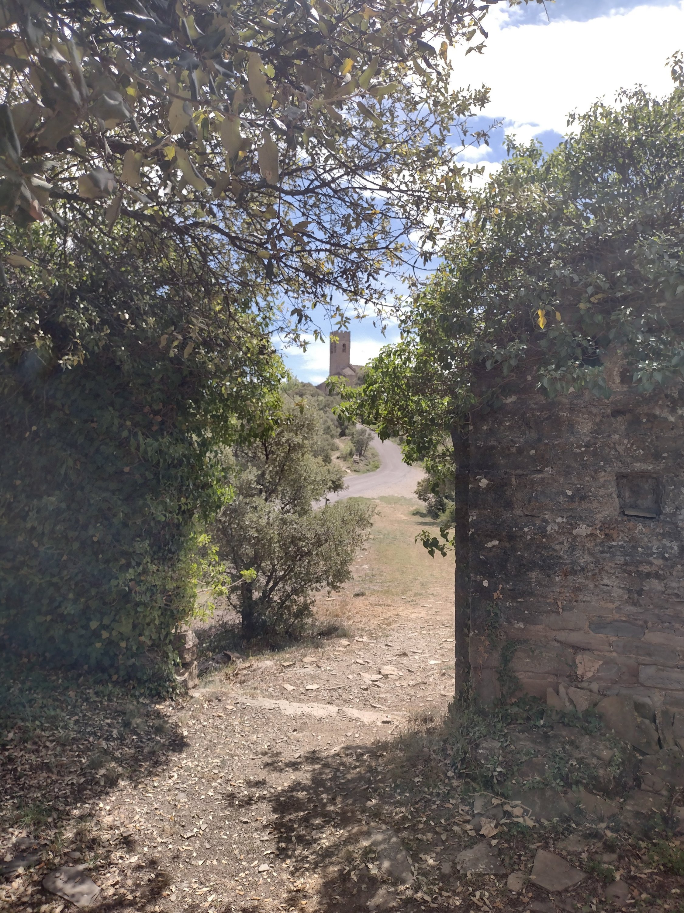 At this point we discovered that the place we were heading for was a religious-military complex, a walled village, undergoing restoration. The church dedicated to Santa Maria built in the 12th century. Inside it was highly decorated with paintings on the ceilings and walls. Within the complex walls was a cemetery, lots of small buildings and the hermitage of Santa Barbara. The panoramic views of the pyrenees and surrounding countryside were as you can imagine, amazing. We could even see Casa de Mur, where we are staying. No idea what the sword in the stone was doing here but we could not get it out.