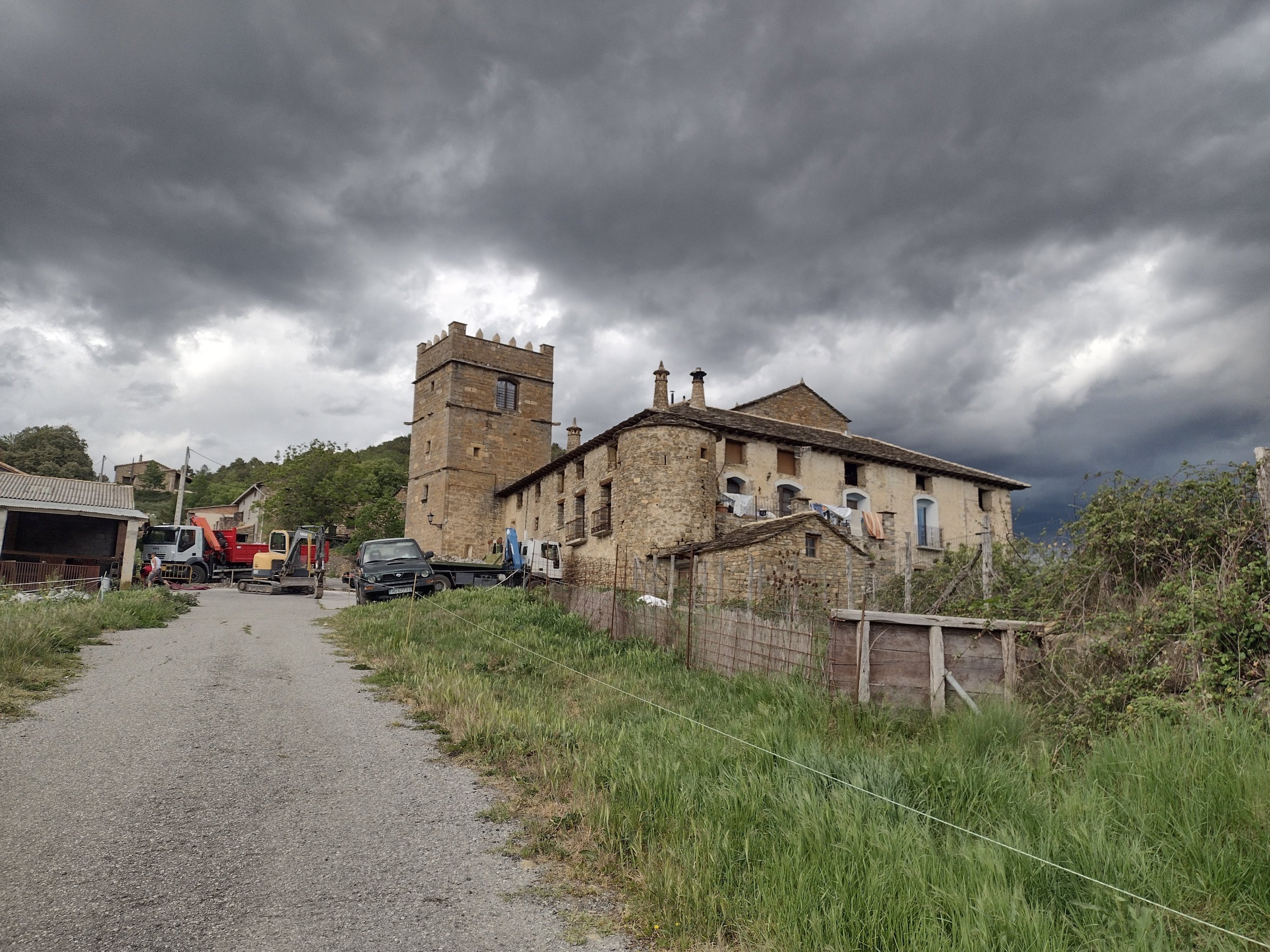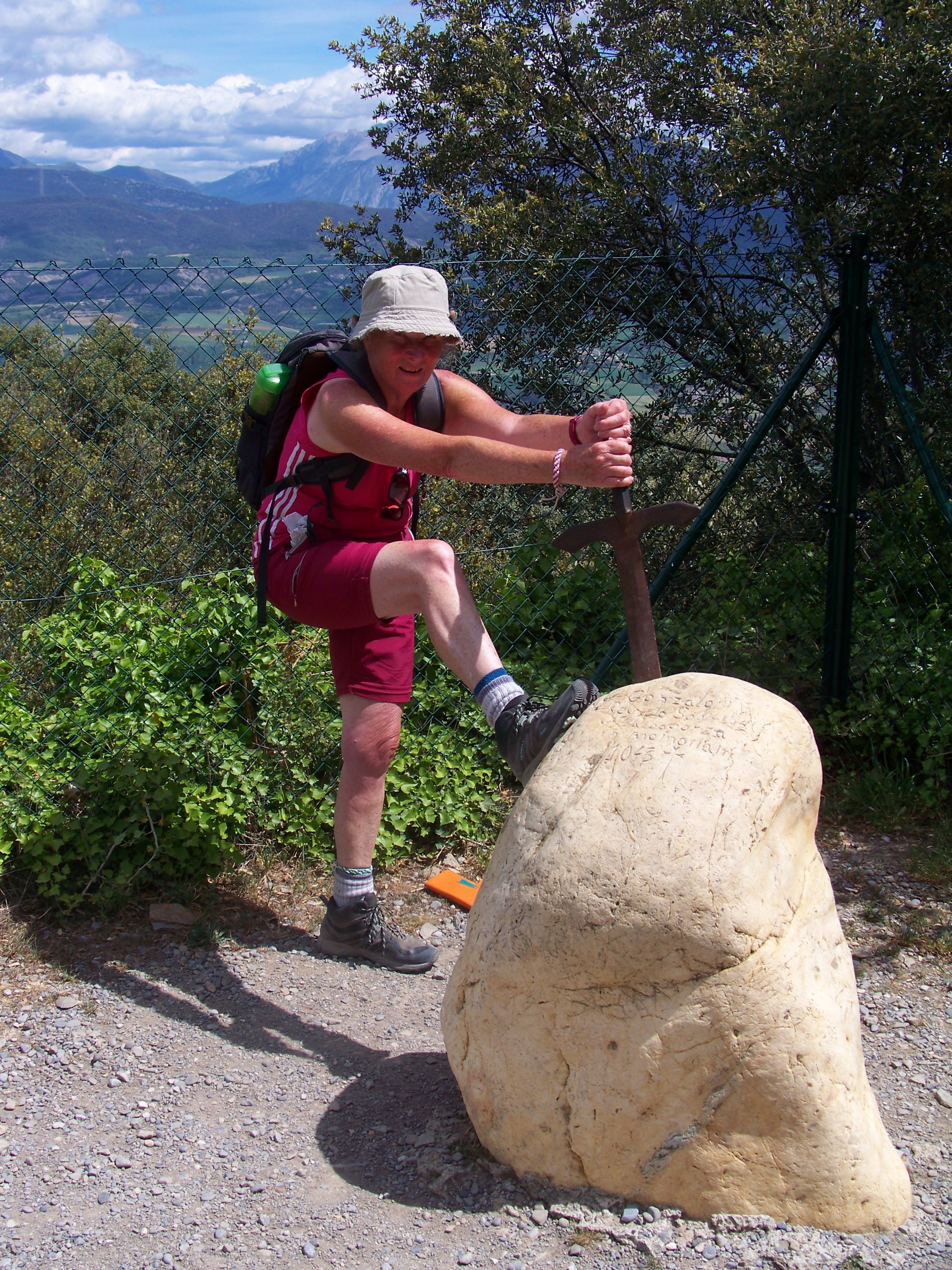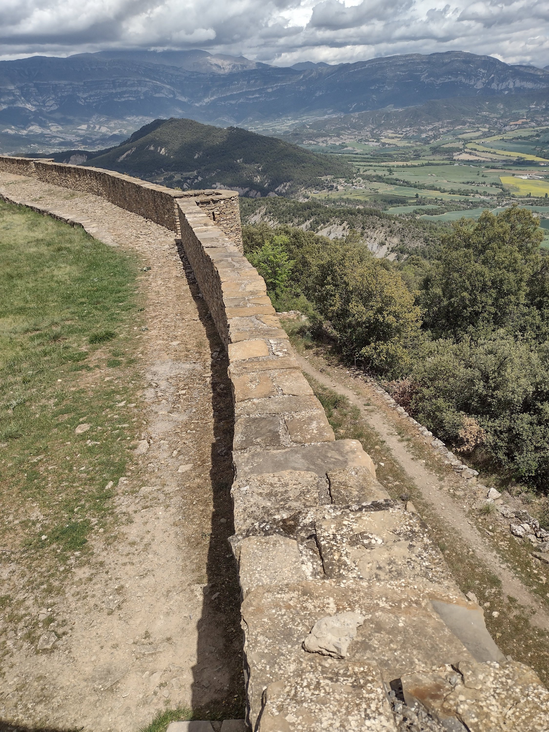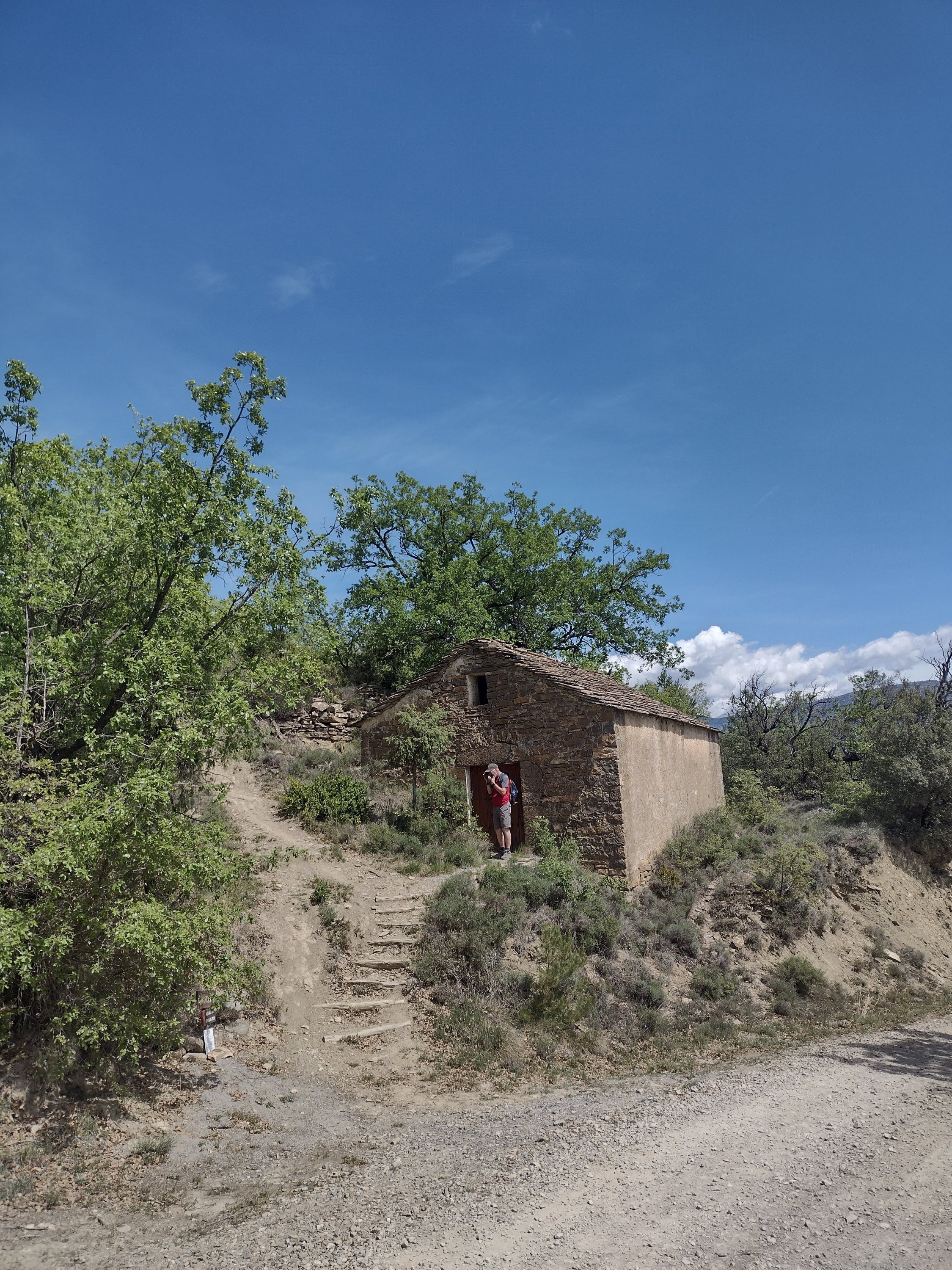 At this point we discovered that the place we were heading for was a religious-military complex, a walled village, undergoing restoration. The church dedicated to Santa Maria built in the 12th century. Inside it was highly decorated with paintings on the ceilings and walls. Within the complex walls was a cemetery, lots of small buildings and the hermitage of Santa Barbara. The panoramic views of the pyrenees and surrounding countryside were as you can imagine, amazing. We could even see Casa de Mur, where we are staying. No idea what the sword in the stone was doing here but we could not get it out.