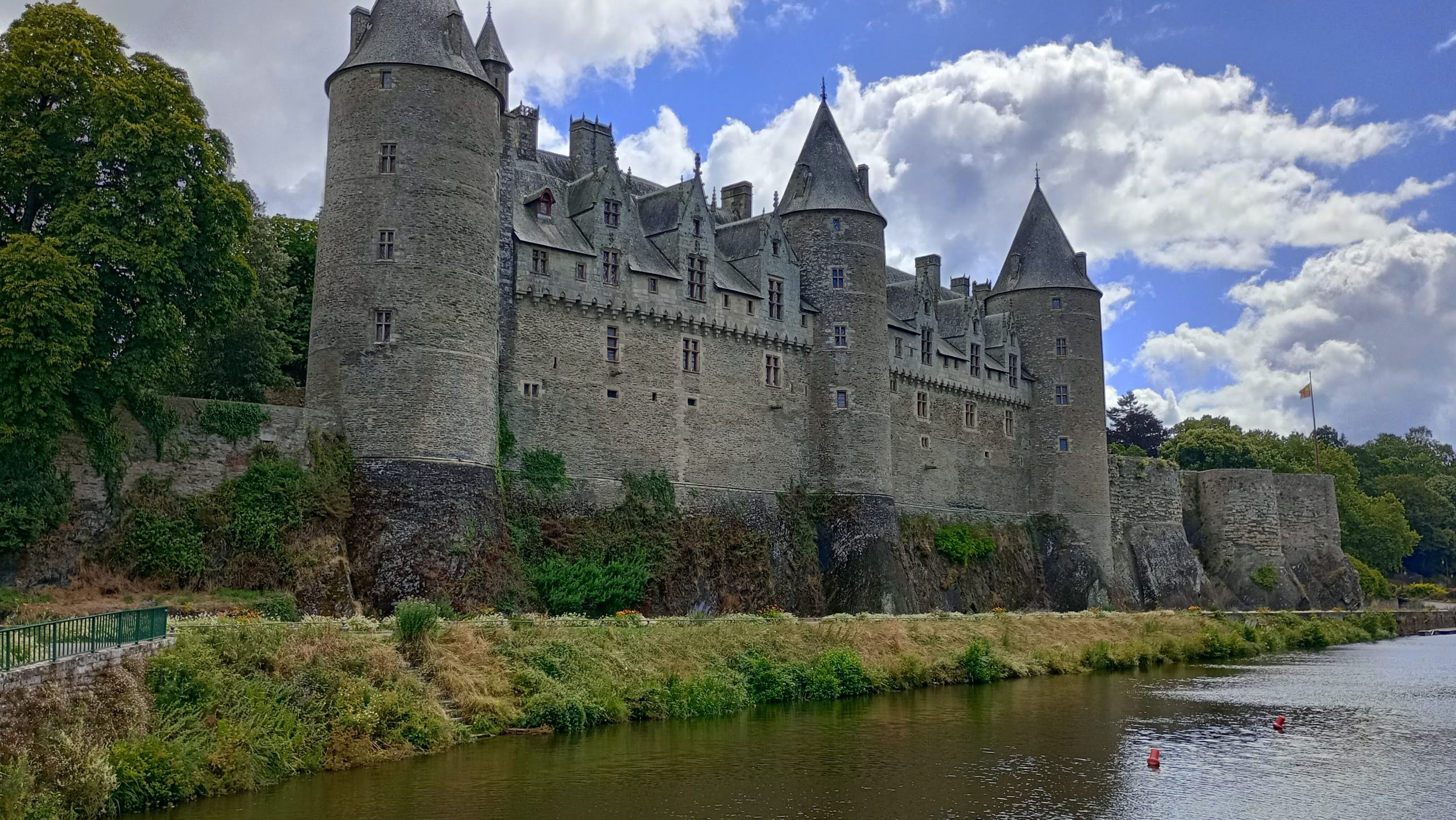 Aptly named, a small city of character. We arrived to masses of flowers and medieval buildings. We drove around several times because all the carports were full because of the Saturday Market. We eventually found a space, walked to the canal and got the full wow factor of Josselin castle.