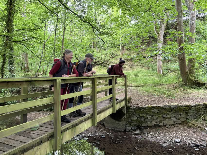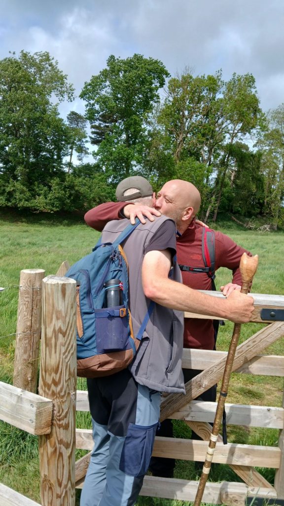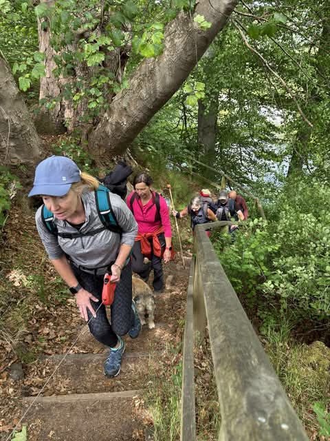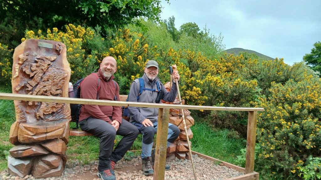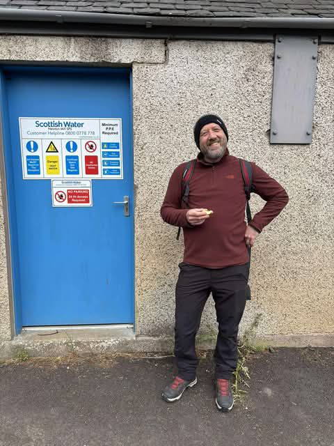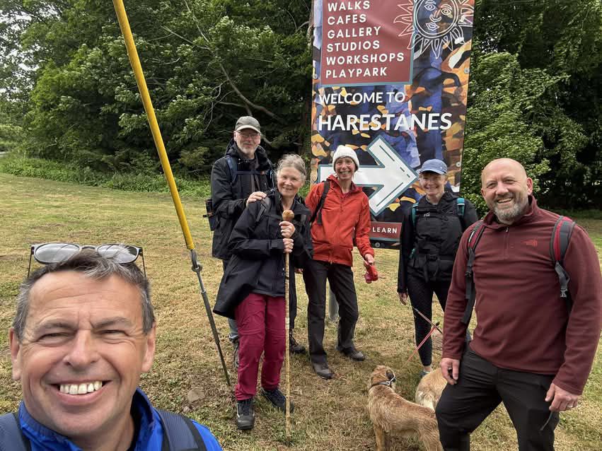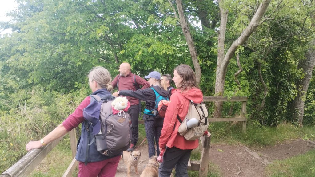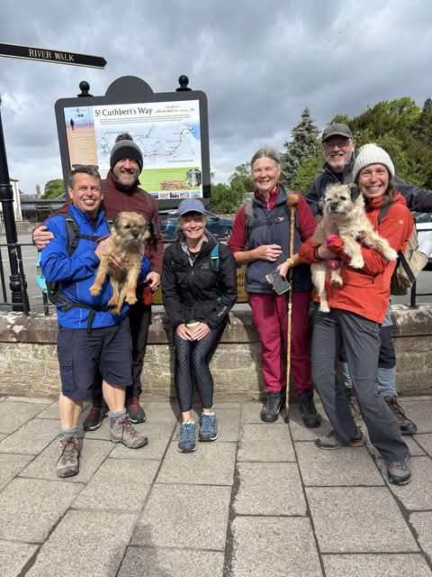 Today was a good day. The six of us plus 2 dogs left Melrose at 9.45am. Up and over the Eildons with ease, a lovely walk down the tweed. The weather holding good all of the way. The dogs enjoyed the water stops, we enjoyed the food stops, and every one enjoyed arriving at the finish at Harestanes. 15.5 miles today finishing earlier than expected.